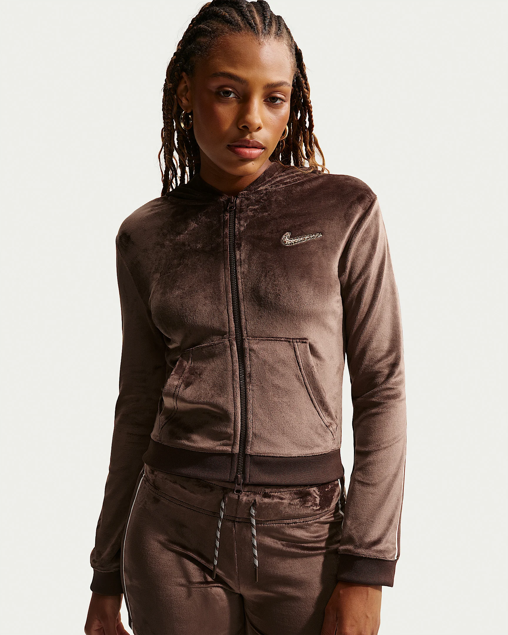 Made with plush velour fabric, this 2-way zip top has enough stretch to help you move freely and enough shine to help you stand out. Piping down the arms adds dimension to your every move. Product Details - Body: 93% polyester/7% spandex. Rib: 98% polyester/2% spandex - Tight fit - Full-length zipper - Machine wash - Imported - Shown: Baroque Brown - Style: IQ0678-237 SIZE & FIT Model is wearing size S and is 5'11"179cm Tight fit: snug and form-fitting