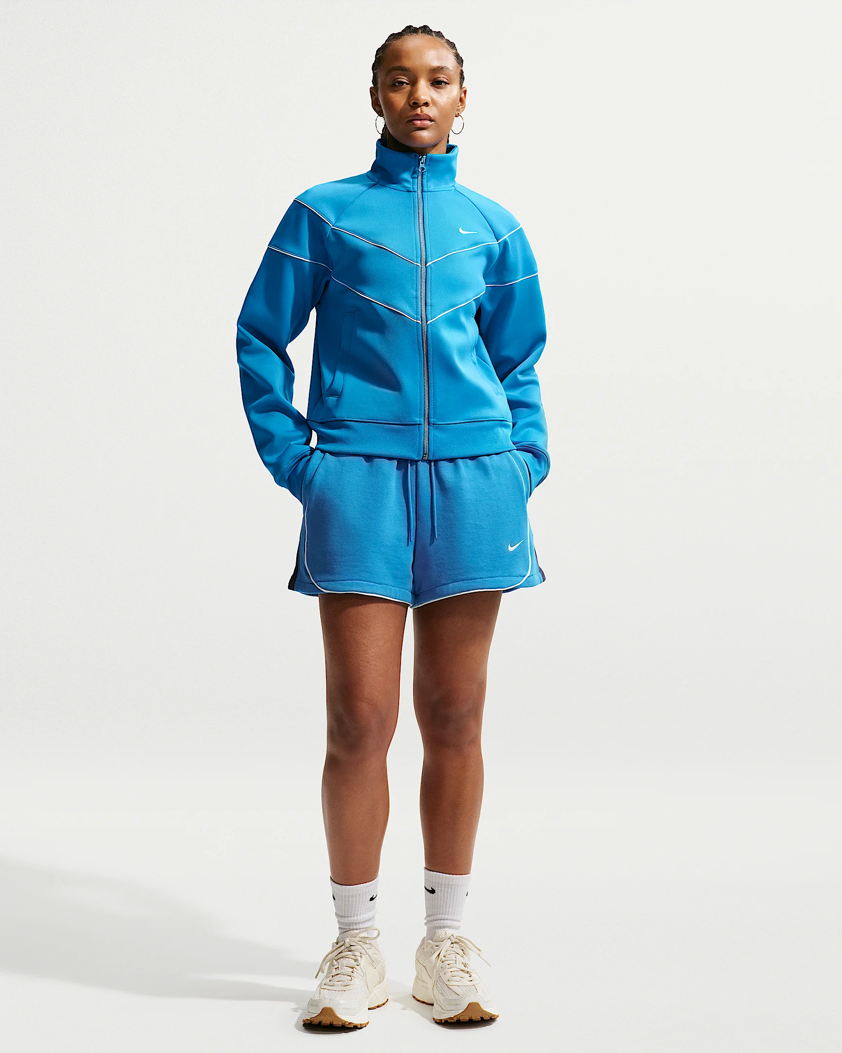 Strut in comfort. These breezy French terry shorts are smooth on the outside with soft loops on the inside. Piping details offer a dose of clean, sport-inspired style. Product Details - Embroidered Swoosh logo - Hand pockets - Elastic waistband with drawcord - 80% cotton/20% polyester - Machine wash - Imported - Shown: Light Photo Blue/Midnight Navy/Sail/Sail - Style: IF0526-435 SIZE & FIT Model is wearing size S and is 5′7″170cm Loose fit: roomy and relaxed