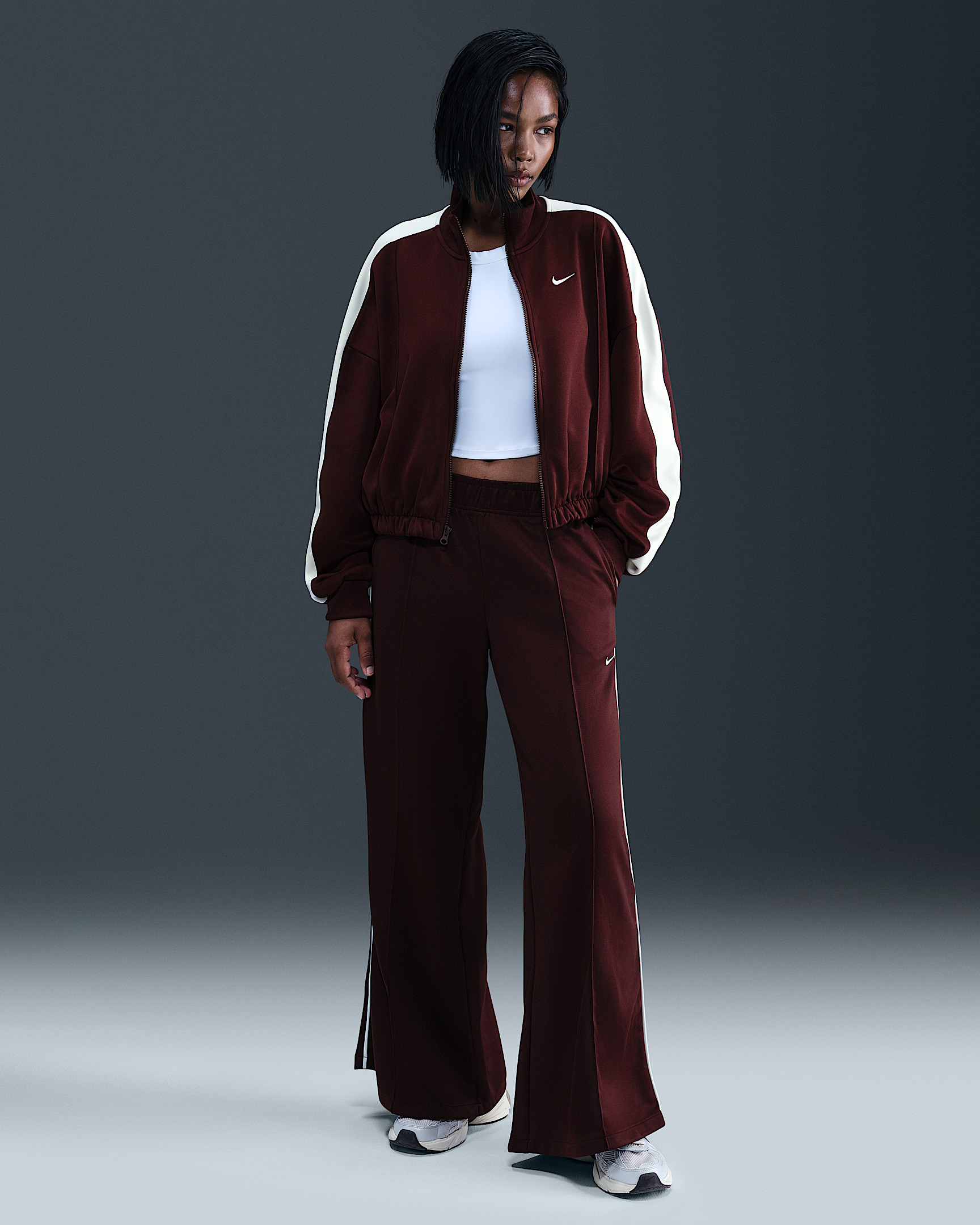 We're reimagining classic track pants. Midweight knit and super wide legs combine to bring effortless drape to your look. Product Details - 100% polyester - Interior drawstring at waist - Embroidered Swoosh logo - Pockets - Machine wash - Imported - Shown: Burgundy Crush/Sail/Sail - Style: IH8514-652 SIZE & FIT Model is wearing size S and is 5′7″170cm Standard fit: easy and traditional Fl length: hits below ankle