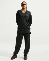 This jersey-inspired tunic elevates the look of sport by combining jacquard stripes and shiny panels with an extra roomy fit and dropped shoulders. Product Details - Embroidered logo - Woven jock tag - Ribbed collar - 100% polyester - Machine wash - Imported - Shown: Black/Black/Black - Style: IF0319-010 SIZE & FIT Model is wearing size S and is 5′11″179cm Oversized fit: exaggerated and spacious