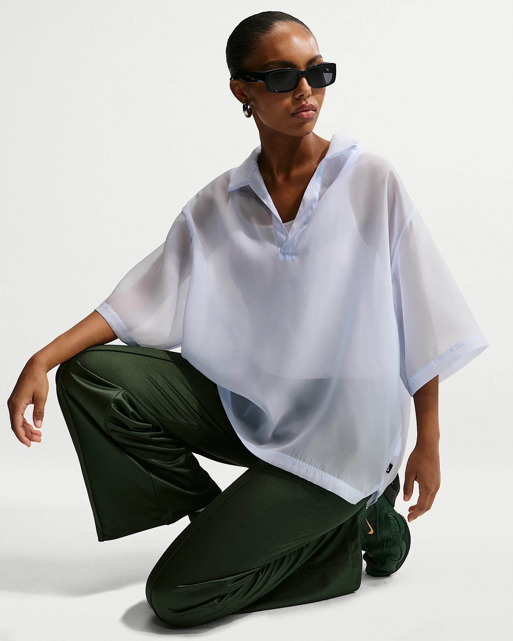 This top is made with lightweight, sheer fabric. Its spacious fit adds to its breezy feel. Product Details - Swoosh logo woven label - 100% polyester - Machine wash - Imported - Shown: Hydrogen Blue/Sail - Style: IR1680-407 SIZE & FIT Model is wearing size S and is 5′9″175cm Oversized fit: exaggerated and spacious
