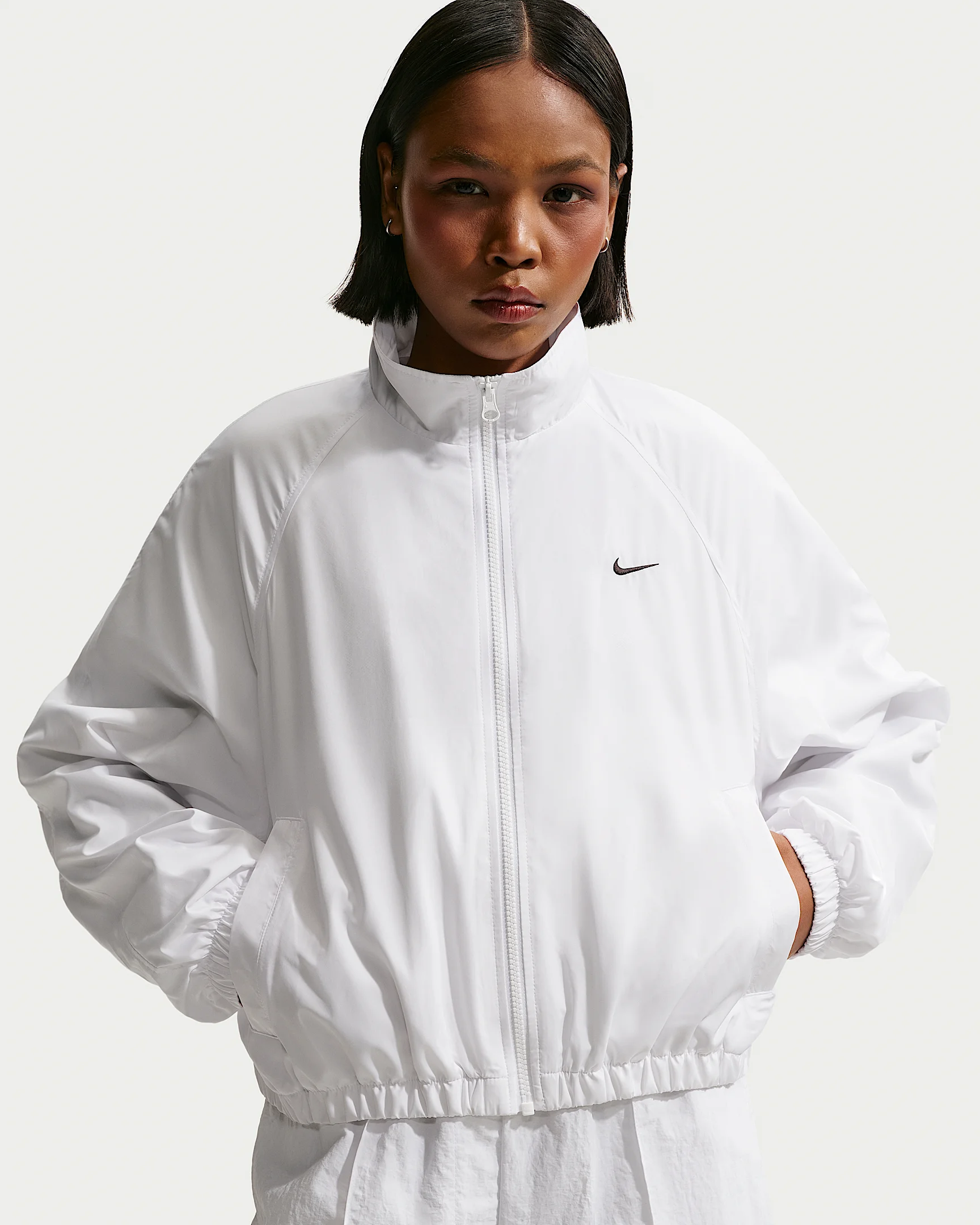 This lightweight taffeta jacket has UV protection to help provide coverage from the rays. Its extra roomy fit is designed to hit at your hips for a boxy look. Raglan sleeves with articulation ground it in sport-inspired style. Product Details - Embroidered logo - Hand pockets - Elastic hem and cuffs - Body: 100% polyester/Lining: 100% polyester. - Machine wash - Imported - This product provides UVA and UVB protection from the sun only in the areas covered by the garment. To protect exposed areas, the use of good quality sunscreen is recommended. - Shown: White/Black - Style: IO1473-100 SIZE & FIT Model is wearing size S and is 5′7″170cm Oversized fit: exaggerated and spacious