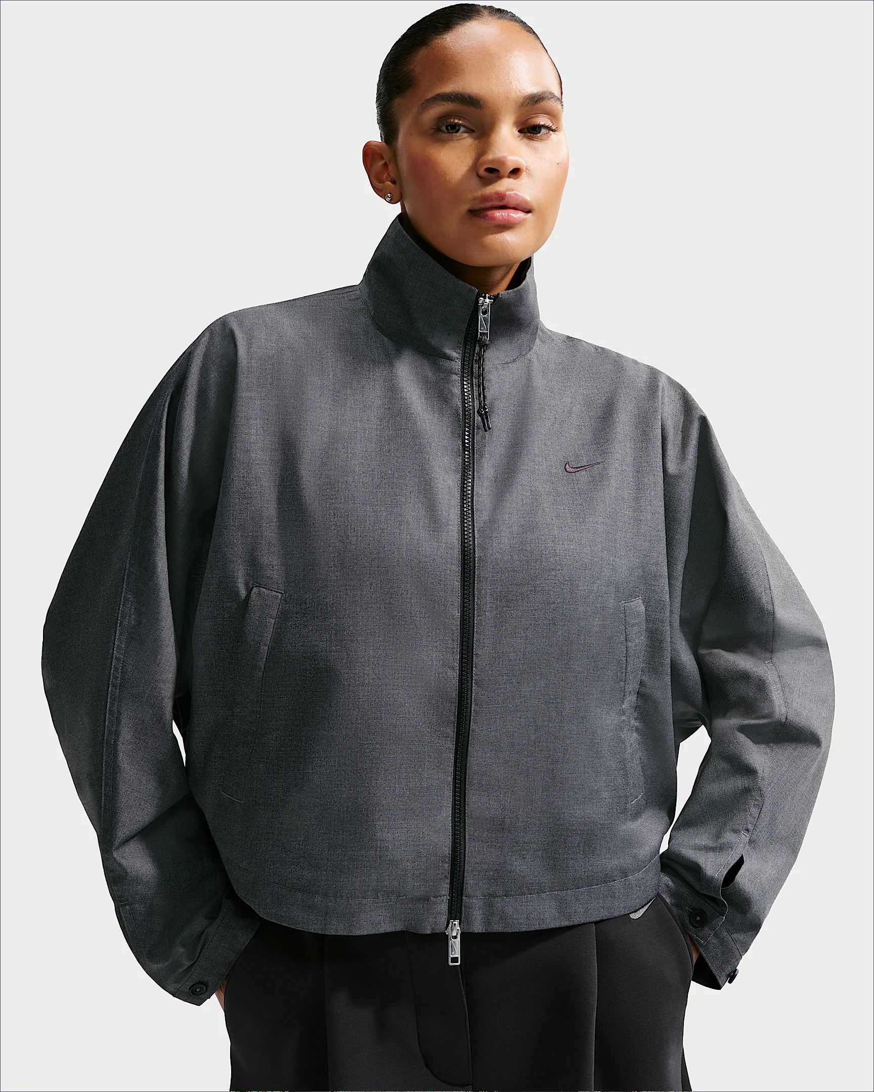 Premium fabric and intentional details give this twill jacket a polished look. Its extra roomy fit is designed to hit at your hips for a boxy look. A two-way zipper let's you switch up your style and coverage. Product Details - Embroidered logo - Zipper guard - Zippered pockets - Button cuffs - Body: 65% polyester/35% rayon. Lining: 100% polyester. - Machine wash - Imported - Shown: Black/Heather/Black - Style: IF5451-010 SIZE & FIT Model is wearing size S and is 5′11″179cm Oversized fit: exaggerated and spacious