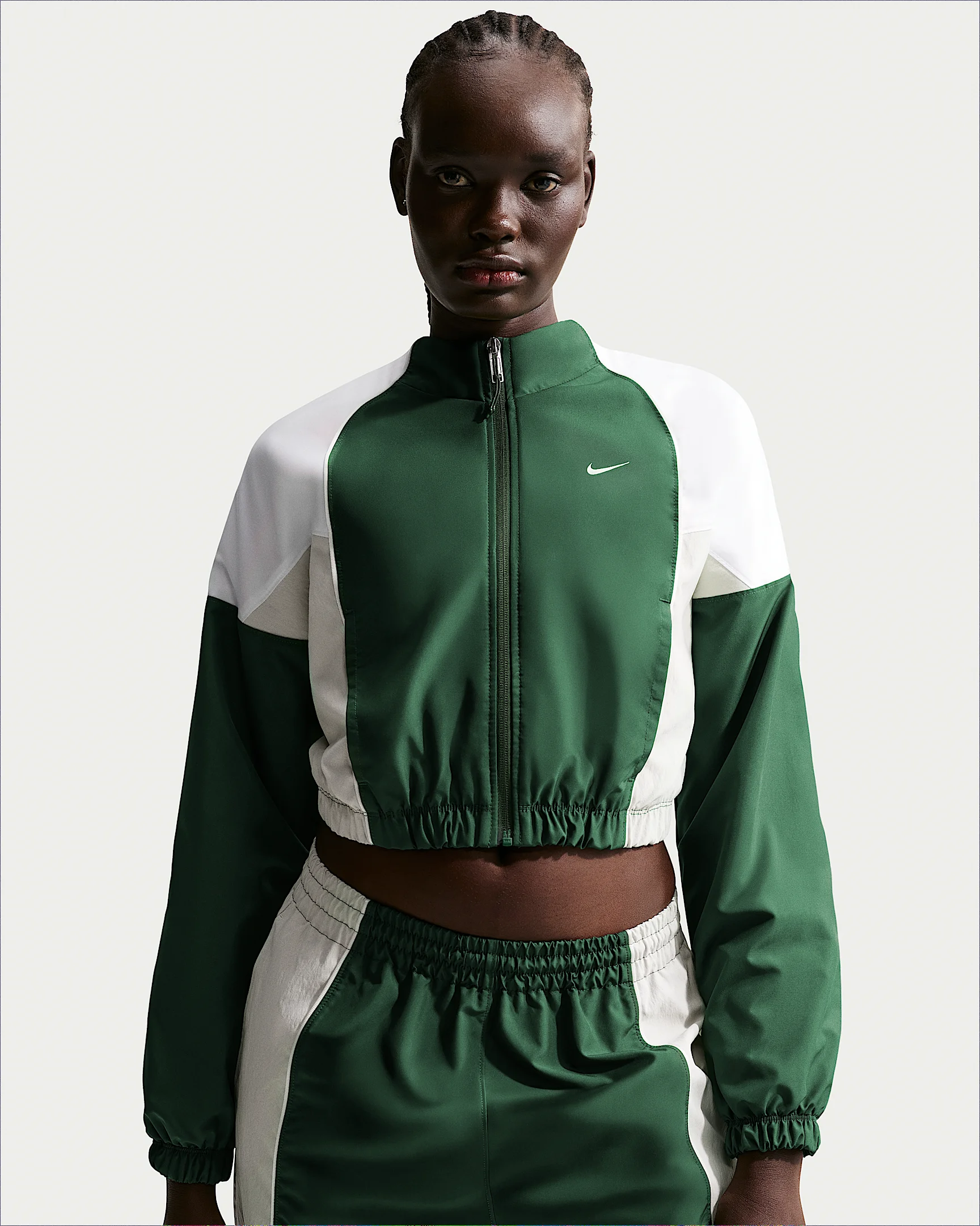 Classic track style gets a modern twist. Designed to hit at your natural waist, this cropped jacket has a shrunken feel for an updated look. Raglan-inspired sleeves and piping details keep it grounded in Nike heritage. Benefits - Water-repellent nylon panels help provide coverage in light rain. - Mesh lining is soft and breathable. Product Details - Embroidered logo - Elastic hem and cuffs - Zip-front closure - Hand pockets - Body: 100% polyester. Panels: 96% nylon/4% spandex. Lining: 100% polyester. - Machine wash - Imported - Shown: Fir/White/Light Bone/Sail - Style: IF0216-323 SIZE & FIT Standard fit: easy and traditional
