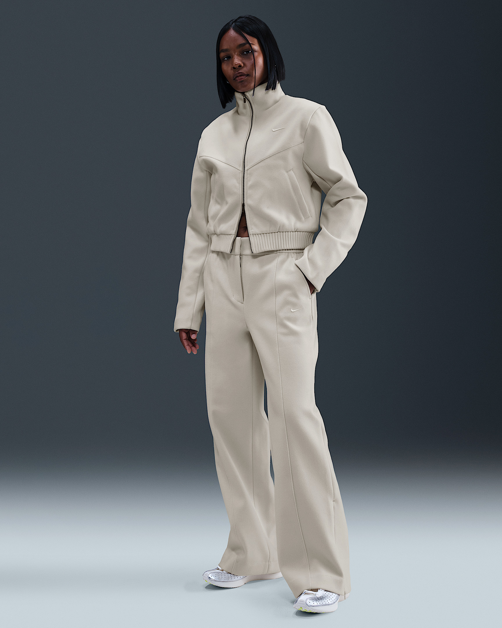 Tailored comfort. These trousers are made from heavyweight French Terry for a structured look you can wear all day. Benefits - Snap and zipper closure on the front give you a streamlined look. - Elastic at back of waistband keeps the mid-rise fit feeling right. - Invisible zippers at the ankles add versatility when styling. Product Details - 100% polyester - Satin-lined pockets - Pin-tucks front and back - Leather jock tag - Embroidered Swoosh logo - Machine wash - Imported - Shown: Pale Ivory/Sail - Style: HV5141-110 SIZE & FIT Model is wearing size S and is 5′7″170cm Standard fit: easy and traditional Fl length: hits below ankle