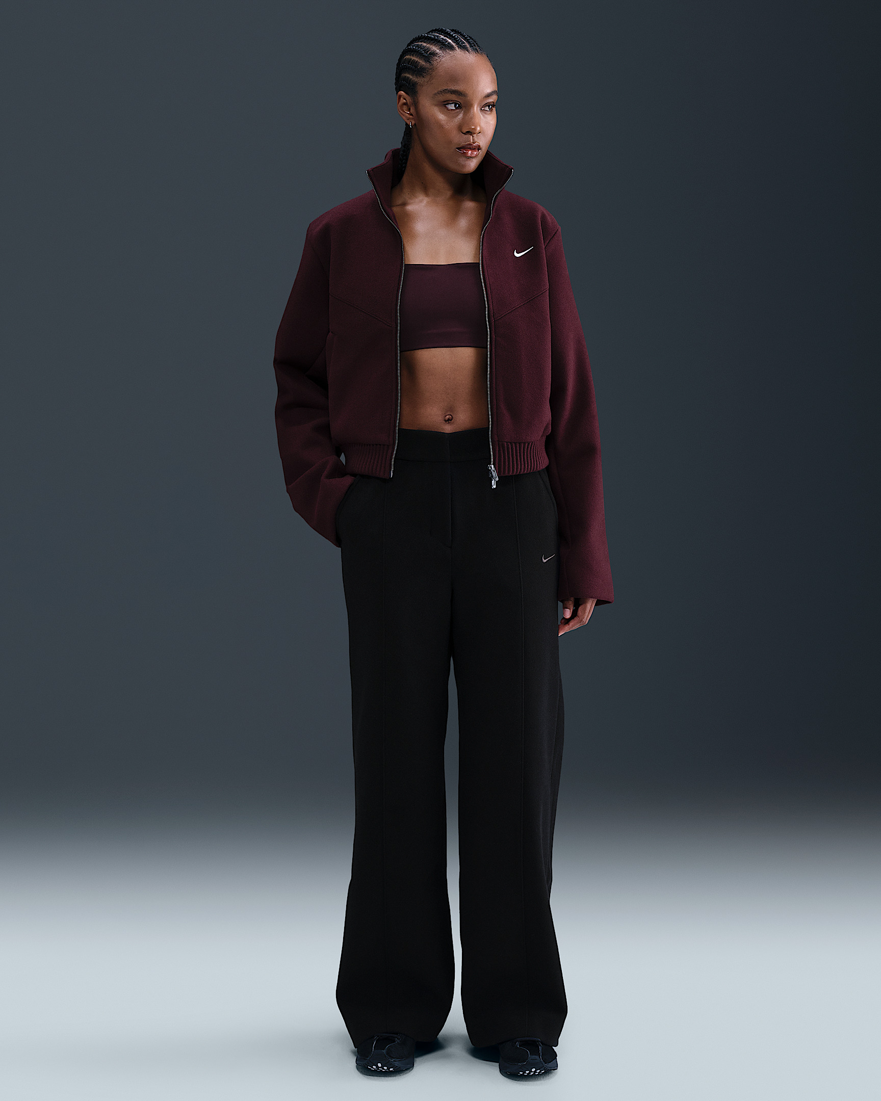 Tailored comfort. These trousers are made from heavyweight French Terry for a structured look you can wear all day. Benefits - Snap and zipper closure on the front give you a streamlined look. - Elastic at back of waistband keeps the mid-rise fit feeling right. - Invisible zippers at the ankles add versatility when styling. Product Details - 100% polyester - Satin-lined pockets - Pin-tucks front and back - Leather jock tag - Embroidered Swoosh logo - Machine wash - Imported - Shown: Black/Anthracite - Style: HV5141-010 SIZE & FIT Model is wearing size S and is 5′7″170cm Standard fit: easy and traditional Fl length: hits below ankle