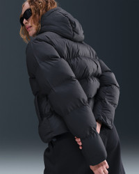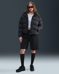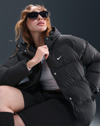 Brush off the cold in this roomy puffer. The water-repellent ripstop fabric and big hood help shield you from light rain, while the Therma-FIT technology helps keep you warm in cold-weather conditions. More Benefits - Style: Warm, hip-length jacket with loose fit - Materials: Water-repellent ripstop - Construction: Lightweight synthetic insulation inside baffles - Storage: Zippered hand pockets and interior pocket - Trim: Zipper closure and bungee toggles at hem - Perks: Collar is lined with cozy fabric Product Details - Body: 100% polyester. Lining: 100% polyester. Fill: 100% polyester. - Bungees with cord lock - Embroidered Therma-FIT logo - Embroidered Swoosh logo - Machine wash - Imported - Shown: Black/White - Style: IH1005-010 SIZE & FIT Model is wearing size S and is 5′1″155cm Loose fit: roomy and relaxed