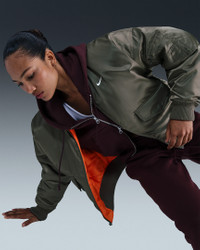 Switch things up in this roomy, reversible jacket. One side has luxe, water-repellent sateen fabric while the other has a cool matte taffeta. Classic bomber jacket details—like thick ribbing at the cuffs and hem, secure hand pockets and a metallic zipper—tie both sides together. More Benefits - Style: Warm, hip-length jacket with loose fit and high-low hem - Materials: Smooth, water-repellent sateen on one side and matte taffeta on the other - Construction: Lightweight synthetic insulation - Storage: Snap closure hand pockets on both sides and a zippered arm pocket - Trim: Zippered closure - Perks: Reversible design Product Details - Body: 100% polyester. Rib: 97% polyester/3% spandex. Fill: 100% polyester - Embroidered Swoosh logo - Hanger loop - Machine wash - Imported - Shown: Medium Olive/Safety Orange/Sail/Sail - Style: HV2812-222 SIZE & FIT Model is wearing size S and is 5′8″171cm Oversized fit: exaggerated and spacious