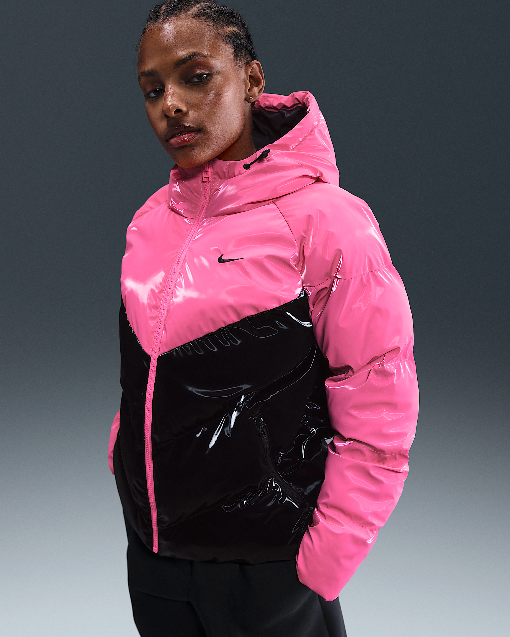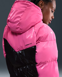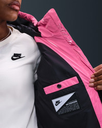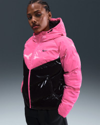 Add some shine to your warmest layer. Nike Therma-FIT technology helps manage your body’s natural heat to help keep you warm in cold-weather conditions. Zippered pockets, a fleece-lined collar and drawcords at the hem and hood round out the design to help you stay cozy even during the coldest months. More Benefits - Style: Warm, hip-length jacket with loose fit - Materials: High-shine recycled polyester - Construction: Synthetic insulation and iconic Windrunner chevron baffles - Storage: Zippered hand pockets and interior pocket - Trim: Zipper closure and bungee toggles at hem - Perks: Collar is lined with cozy fleece fabric Product Details - 100% polyester - Zippered pockets - Interior drop-in pocket - Loose fit - Woven Windrunner label - Embroidered Swoosh logo - Embroidered Therma-FIT logo - Machine wash - Imported - Shown: Pink Glow/Black/Black - Style: HV5242-649 SIZE & FIT Loose fit: roomy and relaxed