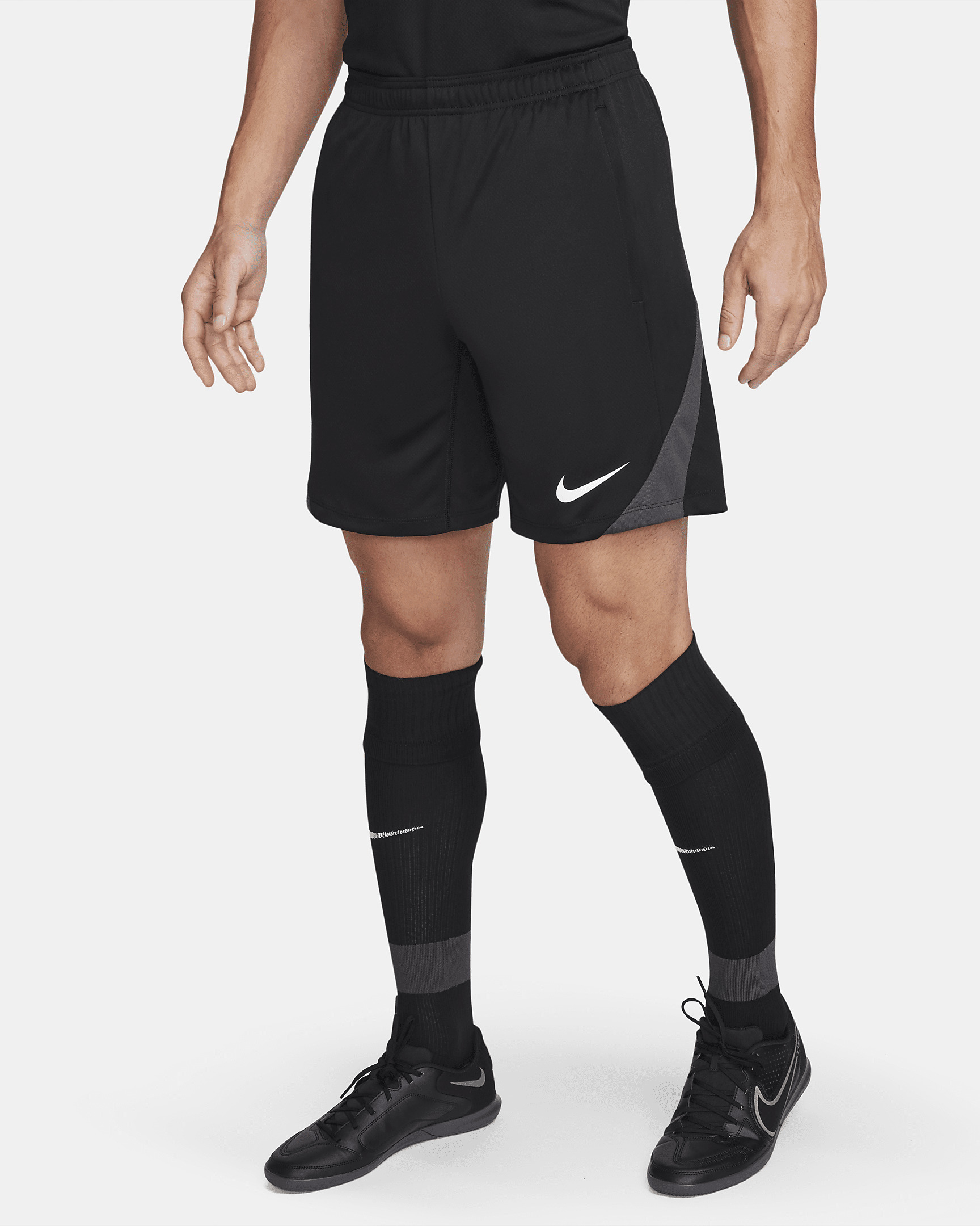 Be your best with the Nike Strike collection—apparel for both elite soccer players and rising stars that helps keep the sweat away on the field. Breathable and sweat wicking, these shorts also have a gusset panel to keep your movement natural and unrestricted. Benefits - Nike Dri-FIT technology moves sweat away from your skin for quicker evaporation, helping you stay dry and comfortable. - Slightly textured stretch-knit fabric is lightweight and breathable. - Elastic waistband with drawcord provides a fit that feels just right. - Gusset design helps maintain a natural range of motion. Product Details - Hand pockets - Ribbed panels - 100% polyester - Machine wash - Imported - Shown: Black/Black/Anthracite/White - Style: FN2401-010 SIZE & FIT Model is wearing size M and is 6′2″188cm Standard fit: easy and traditional