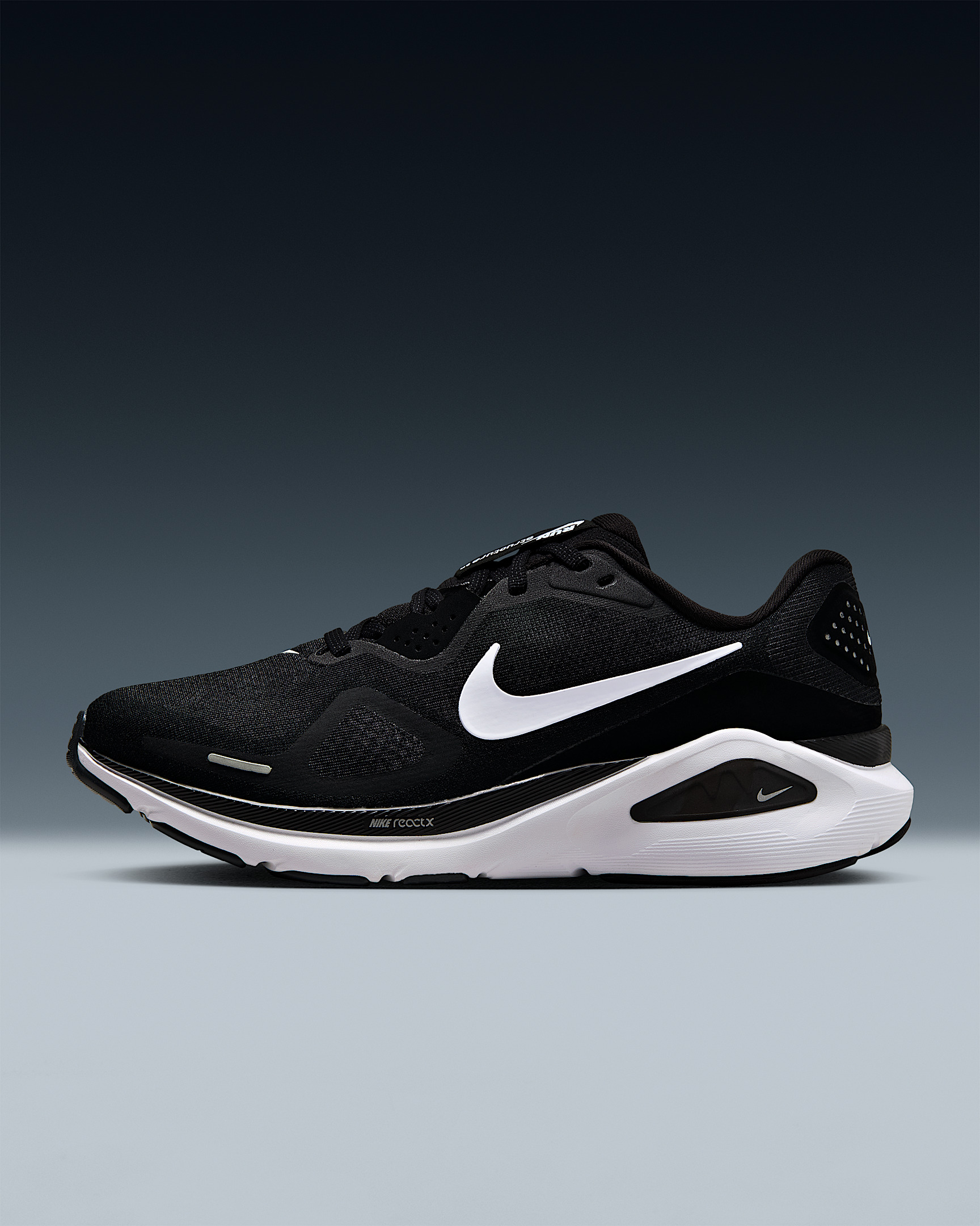 Supportive cushioning in the Structure 26 provides steadiness for everyday runs. A full-length ReactX midsole delivers a cushioned, yet stable transition from heel to toe off. Plus, a tried-and-true midfoot support system wraps around your arch and heel to provide a firm platform. More Benefits - ReactX foam underfoot and higher stack height for stability and support - Lighter, more flexible rubber in forefoot of outsole for cushioning - High-abrasion rubber in heel for increased durability Product Details - Weight: Approx. 262g/9.2oz (Women’s US 8) - Heel-to-toe drop: 10mm - Reflective details - Not intended for use as Personal Protective Equipment (PPE) - Shown: Black/Wolf Grey/Metallic Silver/White - Style: HQ2589-001