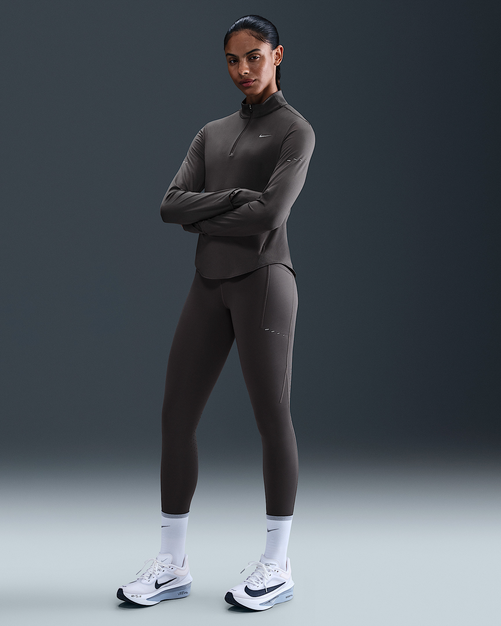 Using insights from runners like you, we prioritized functionality to refresh our Swift essentials. These midweight, sweat-wicking leggings have been designed to help reduce chafing and improve breathability. Three pockets store your essentials so you can rack up your miles with everything you need close by. Product Details - Reflective graphics on outer thighs - Not intended for use as Personal Protective Equipment (PPE) - Internal drawcord - Body/Gusset lining: 75% polyester/25% spandex - Machine wash - Imported - Shown: Thunder Grey - Style: HJ2252-036 SIZE & FIT Model is wearing size S and is 5′10″178cm Tight fit: snug and form-fitting Medium support: feels ke a snug hold to keep everything in place 78 length: hits at ankle High-Waisted: sits at or above your natural waist for more coverage