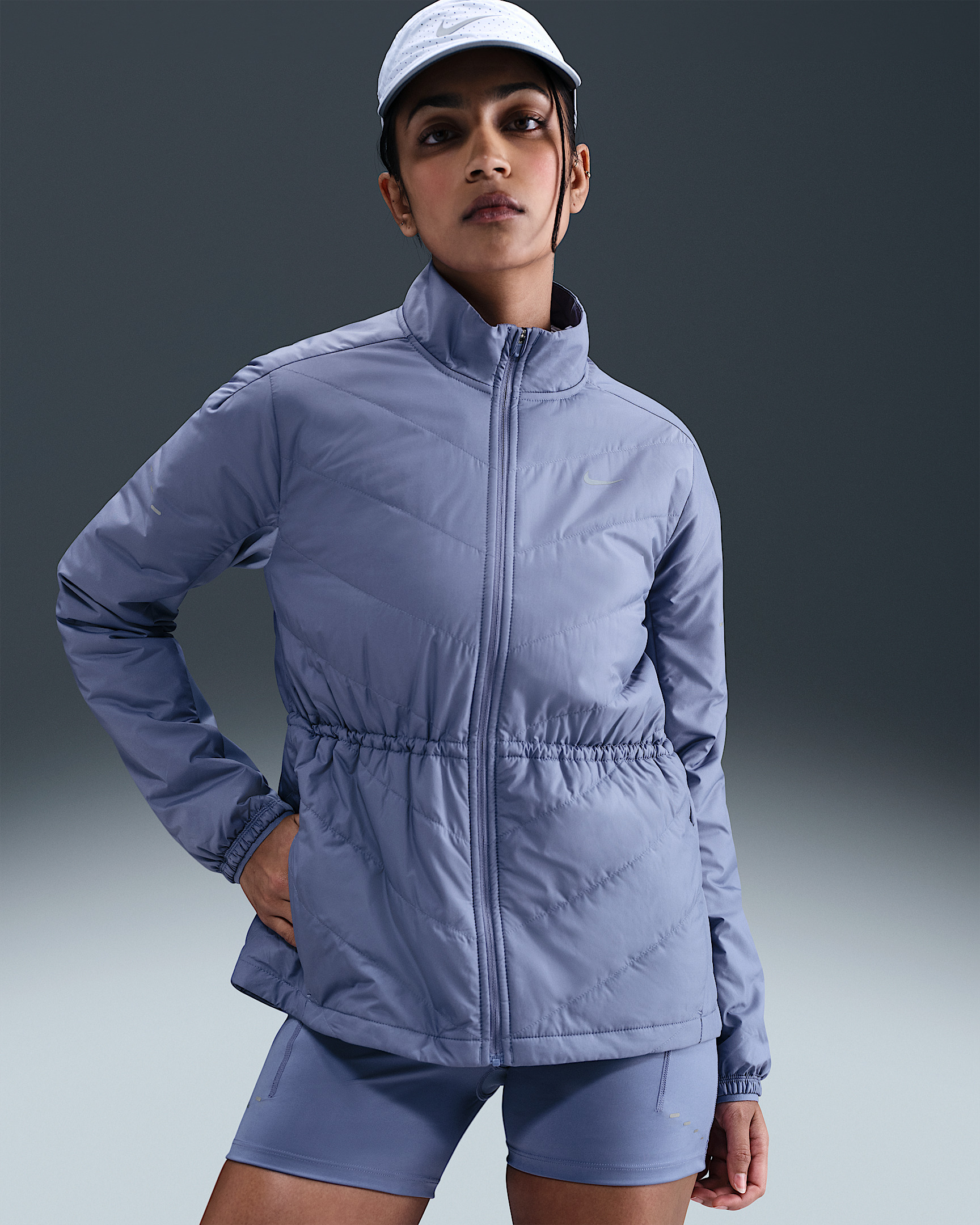 Don't let chilly temps stop you from running. A smooth, water-repellent shell teams up with synthetic insulation and a heat-regulating back panel to give you lightweight warmth in a made-to-move design. Benefits - Nike Therma-FIT technology helps manage your body’s natural heat to help keep you warm in cold-weather conditions. - Synthetic fill helps keep you insulated and warm. - Drawcord at the waist lets you cinch in the jacket for a more tailored fit. - Brushed knit back panel offers the stretch you need for easy movement. - Zippered side pockets offer secure storage for small essentials. Product Details - Body/Lining/Fill/Back of panels fabric: 100% polyester. Face of panels fabric: 82% polyester/18% spandex. - Reflective details - Whistle at collar - Not intended for use as Personal Protective Equipment (PPE) - Machine wash - Imported - Shown: World Indigo - Style: HV2744-499 SIZE & FIT Model is wearing size S and is 5′7″170cm Standard fit: easy and traditional