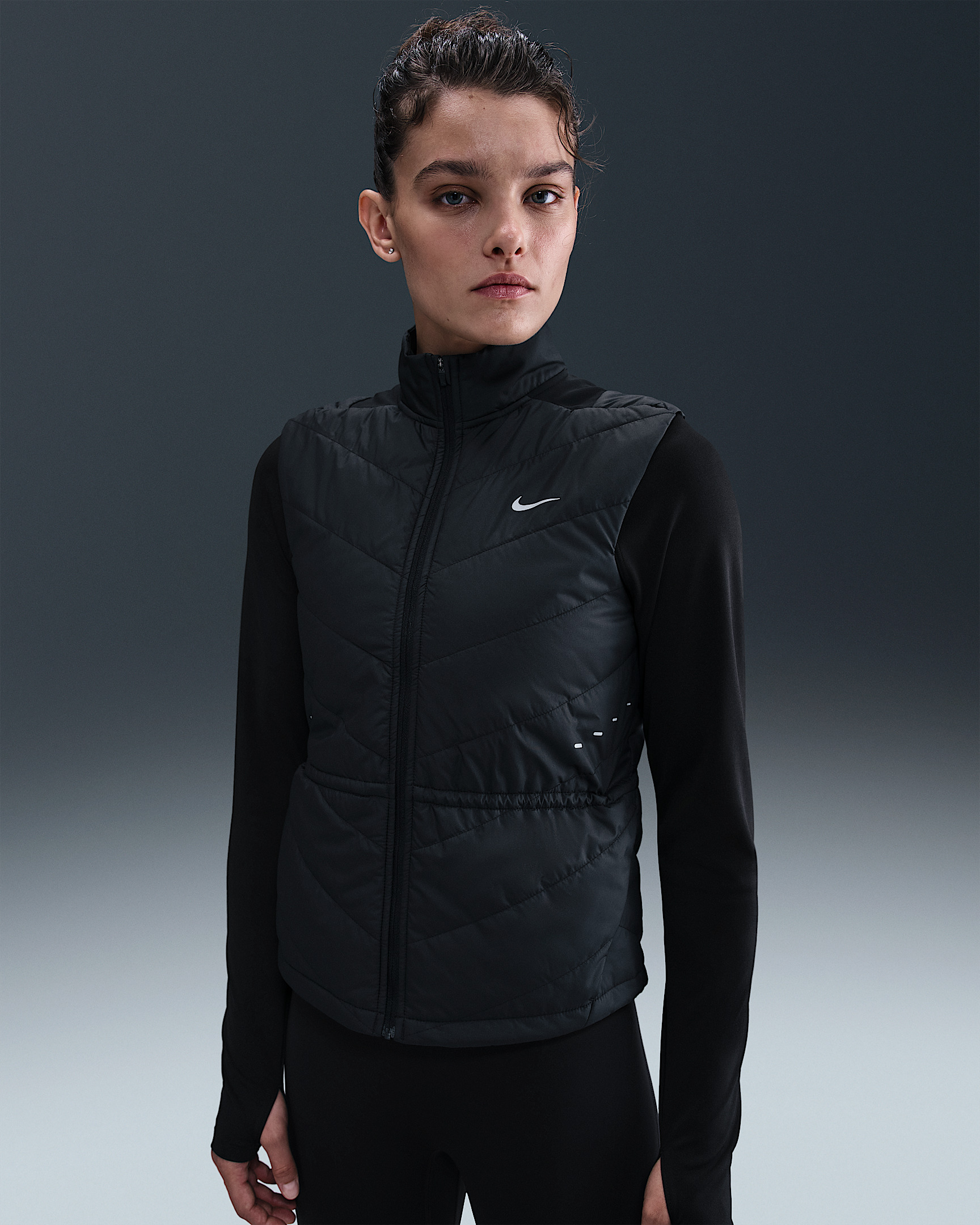 Don't let chilly temps stop you from running. A smooth, water-repellent shell teams up with synthetic insulation and a heat-regulating back panel to give you lightweight warmth in a made-to-move design. Benefits - Nike Therma-FIT technology helps manage your body’s natural heat to help keep you warm in cold-weather conditions. - Synthetic fill helps keep you insulated and warm. - Drawcord at the waist lets you cinch in the vest for a more tailored fit. - Brushed knit back panel offers the stretch you need for easy movement. - Zippered side pockets offer secure storage for small essentials. Product Details - Body/Lining/Fill/Back of panels fabric: 100% polyester. Face of panels fabric: 82% polyester/18% spandex. - Reflective details - Whistle at collar - Not intended for use as Personal Protective Equipment (PPE) - Machine wash - Imported - Shown: Black - Style: HV2655-010 SIZE & FIT Model is wearing size S and is 5′8″173cm