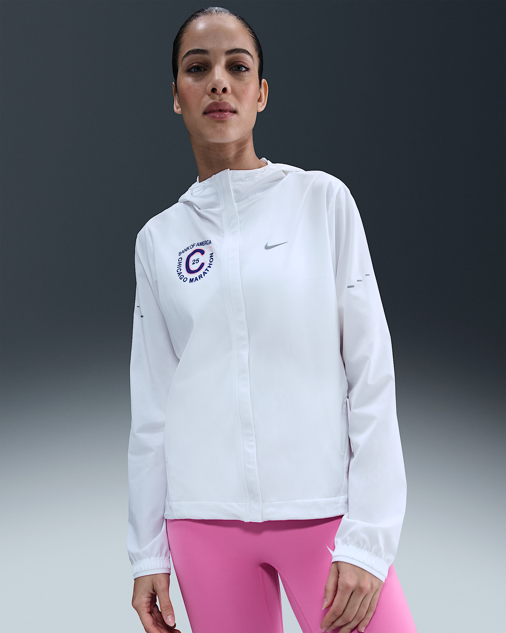 Celebrate the Bank of America Chicago Marathon in this lightweight jacket. Its water-repellent and UV-blocking fabric is paired with a print on the back that's inspired by the windy city's iconic transit system. Benefits - Water-repellent finish helps keep you dry in wet weather. - Modified raglan sleeves are designed to help reduce underarm chafing and allow for a wider range of motion. - A mesh vent on the back helps moisture escape. - Jacket packs into its own pocket for compact carrying. Product Details - Two front zip pockets - This product provides UVA and UVB protection from the sun only in the areas covered by the garment. To protect exposed areas, the use of good quality sunscreen is recommended. - Body: 80% polyester/20% spandex. Mesh: 100% polyester. - Machine wash - Imported - Shown: White - Style: HQ4305-100 SIZE & FIT Model is wearing size S and is 5′9″175cm Standard fit: easy and traditional