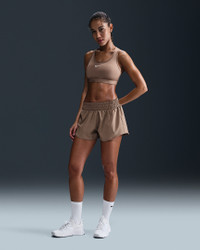 You're on the move. Your padding shouldn't be. This Swoosh bra's sewn-in pads stay in place so you can work hard without worrying about them shifting or folding. Great for training workouts and dance classes, medium support gives you a snug hold that helps keep everything in place. Plus, sweat-wicking, adaptive material quickly recovers its shape so you can stay comfortable throughout your workout. Product Details - Body: 72% polyester/28% spandex. Mesh: 81% polyester/19% spandex. Back lining: 72% polyester/28% spandex. Pad back fabric: 100% polyester. Pad: 100% polyurethane. - Machine wash - Imported - Shown: Mink Brown/White - Style: DX6821-233 SIZE & FIT Model is wearing size S Model height: 5′9″175cm Model bust: 34″86cm Tight fit: snug and form-fitting Medium support: feels ke a snug hold to keep everything in place