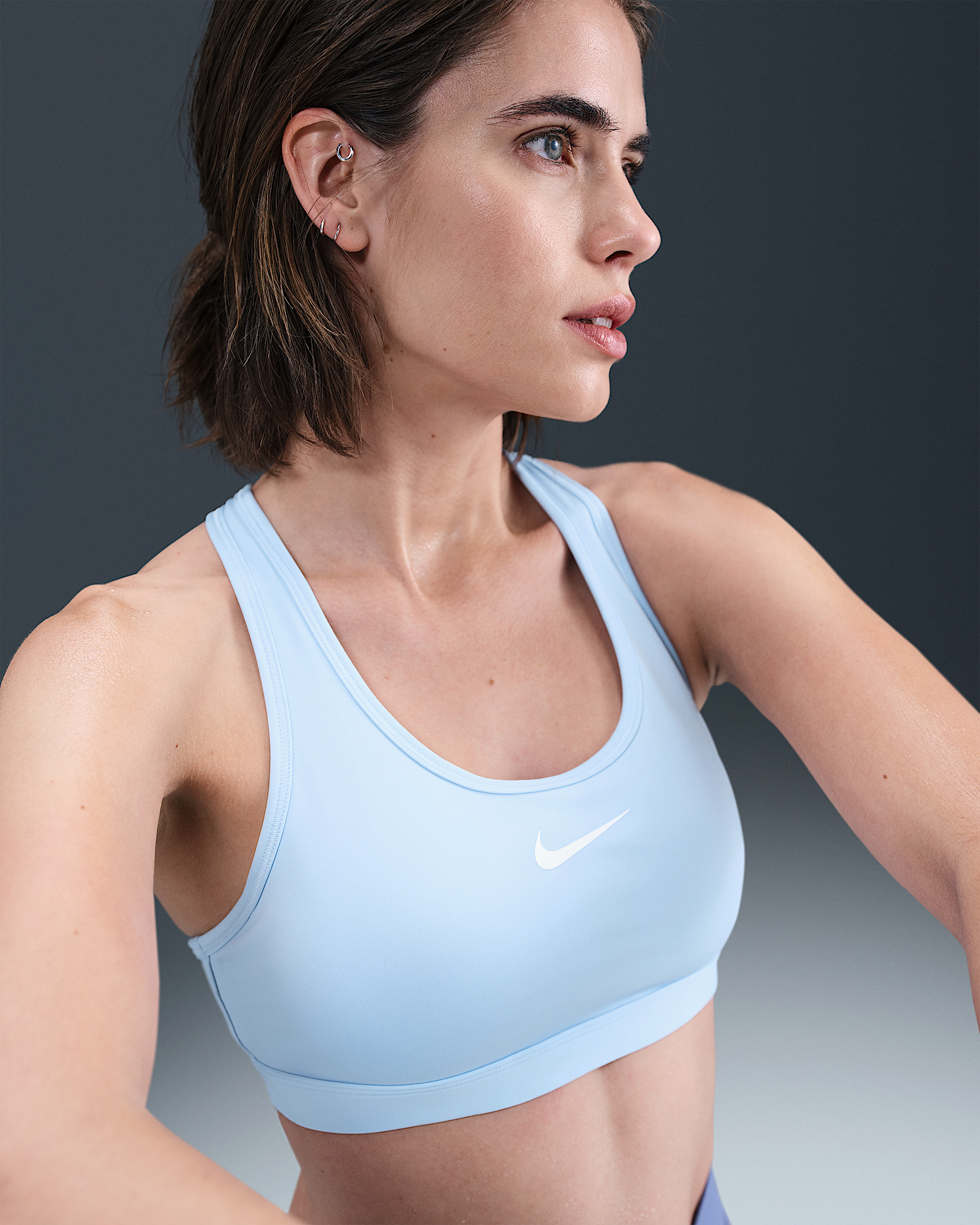 You're on the move. Your padding shouldn't be. This Swoosh bra's sewn-in pads stay in place so you can work hard without worrying about them shifting or folding. Great for training workouts and dance classes, medium support gives you a snug hold that helps keep everything in place. Plus, sweat-wicking, adaptive material quickly recovers its shape so you can stay comfortable throughout your workout. Product Details - Body: 72% polyester/28% spandex. Mesh: 81% polyester/19% spandex. Back lining: 72% polyester/28% spandex. Pad back fabric: 100% polyester. Pad: 100% polyurethane. - Machine wash - Imported - Shown: Celestine Blue/White - Style: DX6821-442 SIZE & FIT Model is wearing size S Model height: 5′9″175cm Model bust: 32″81cm Tight fit: snug and form-fitting Medium support: feels ke a snug hold to keep everything in place