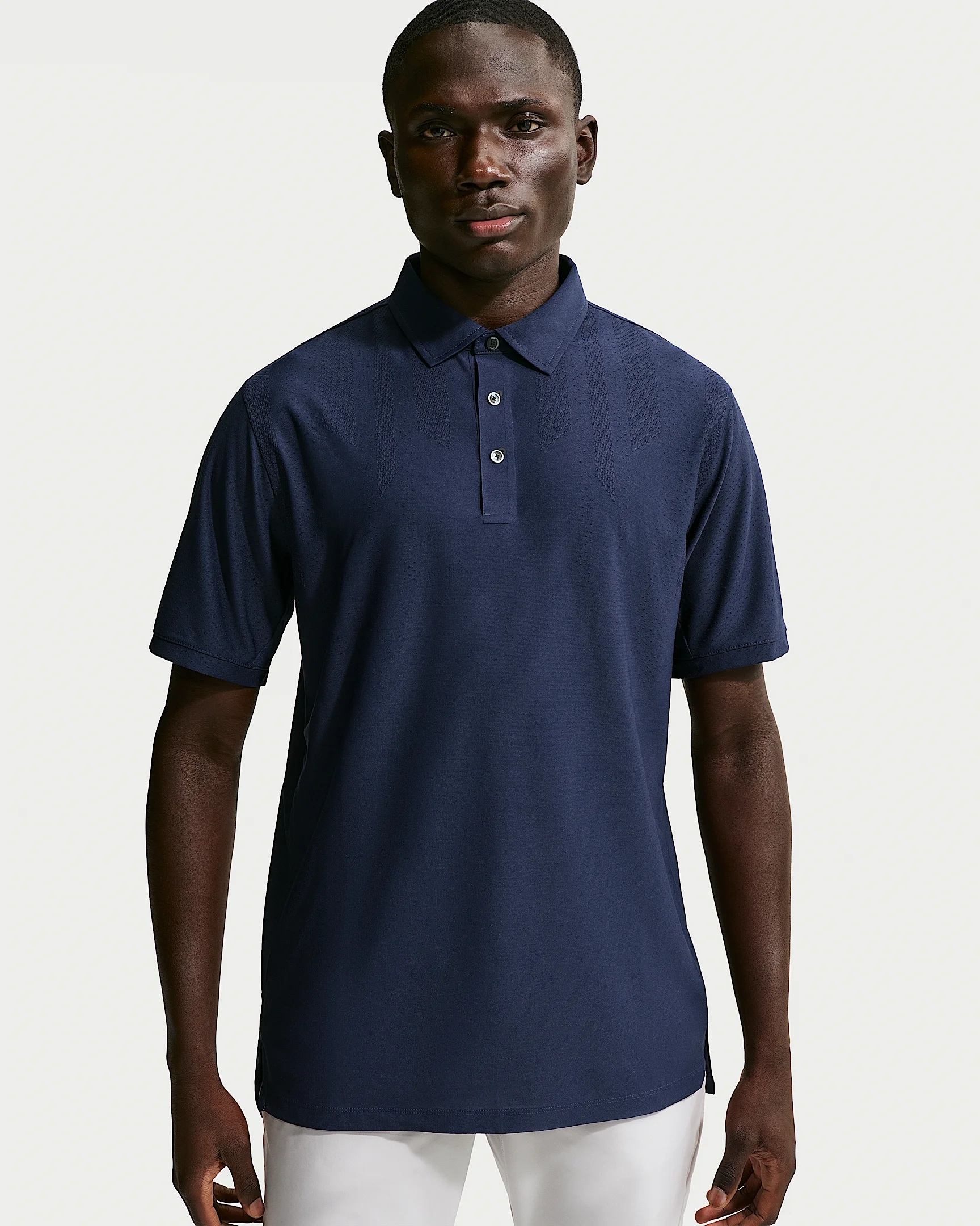 You demand greatness on the course. That’s why we obsessed every detail of this polo. The two main ones? Its premium jacquard knit fabric and underarm mesh provide breathability and the room you need to make a full turn with ease. Benefits - Nike Dri-FIT technology moves sweat away from your skin for quicker evaporation, helping you stay dry and comfortable. - Split hem and drop tail design provide the coverage and mobility you need to look and feel your best while you play. - Taping on the shoulder seam and button holes provides a premium look and feel. - Engineered front and back panels provide a clean, structured fit. Product Details - 3-button placket - Body: 100% polyester. Mesh: 89% polyester/11% spandex. - Machine wash - Imported - Shown: College Navy/College Navy - Style: IB0205-419 SIZE & FIT Model is wearing size M and is 6′1″184cm Standard fit: easy and traditional
