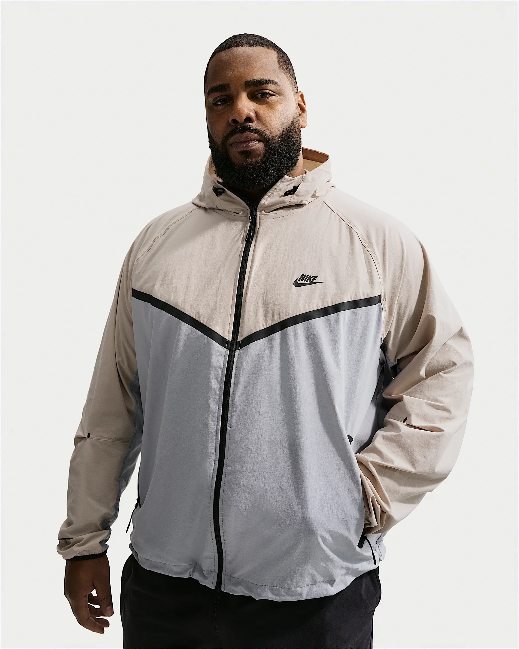 Nike Tech infused with a dose of Nike Heritage. This roomy jacket is crafted with cool and crinkly nylon fabric that's sweat wicking and slightly stretchy. Chevron design lines are inspired by the historic Nike Windrunner track jacket while articulation at the elbows grounds it in a distinct Nike Tech aesthetic. Benefits - Adjustable drawcord and cordlock at the hem and hood let you switch up your fit and coverage. - Roomy fit through the body makes it an easy layer. Product Details - Two-way zipper - Zippered hand pockets - Body: 94% nylon/6% spandex. Pocket bags: 100% polyester. - Machine wash - Imported - Shown: Wolf Grey/Cream II/Black - Style: IU6965-012 SIZE & FIT Loose fit: roomy and relaxed