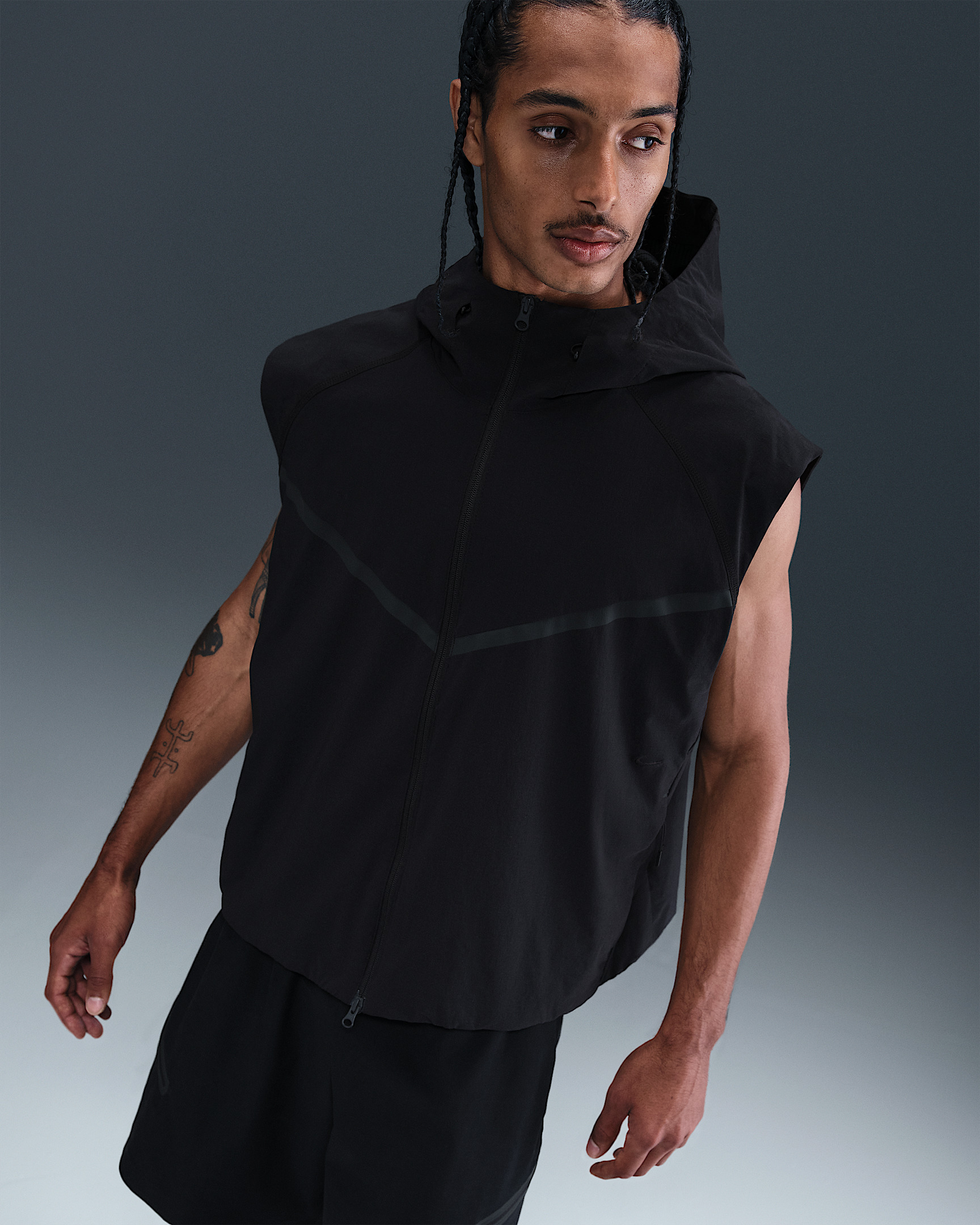 This iconic Tech Windrunner vest is crafted with cool and crinkly nylon fabric that's sweat wicking and slightly stretchy. A relaxed fit, mesh lining and an adjustable lined hood combine to create versatile comfort. Product Details - Embroidered Nike Swoosh logo - Two-way zipper - Zippered hand pockets - Body: 94% nylon/6% spandex. Lining: 100% polyester. - Machine wash - Imported - Shown: Black/Black - Style: HV0982-010 SIZE & FIT Model is wearing size M and is 6′1″185cm Standard fit: easy and traditional