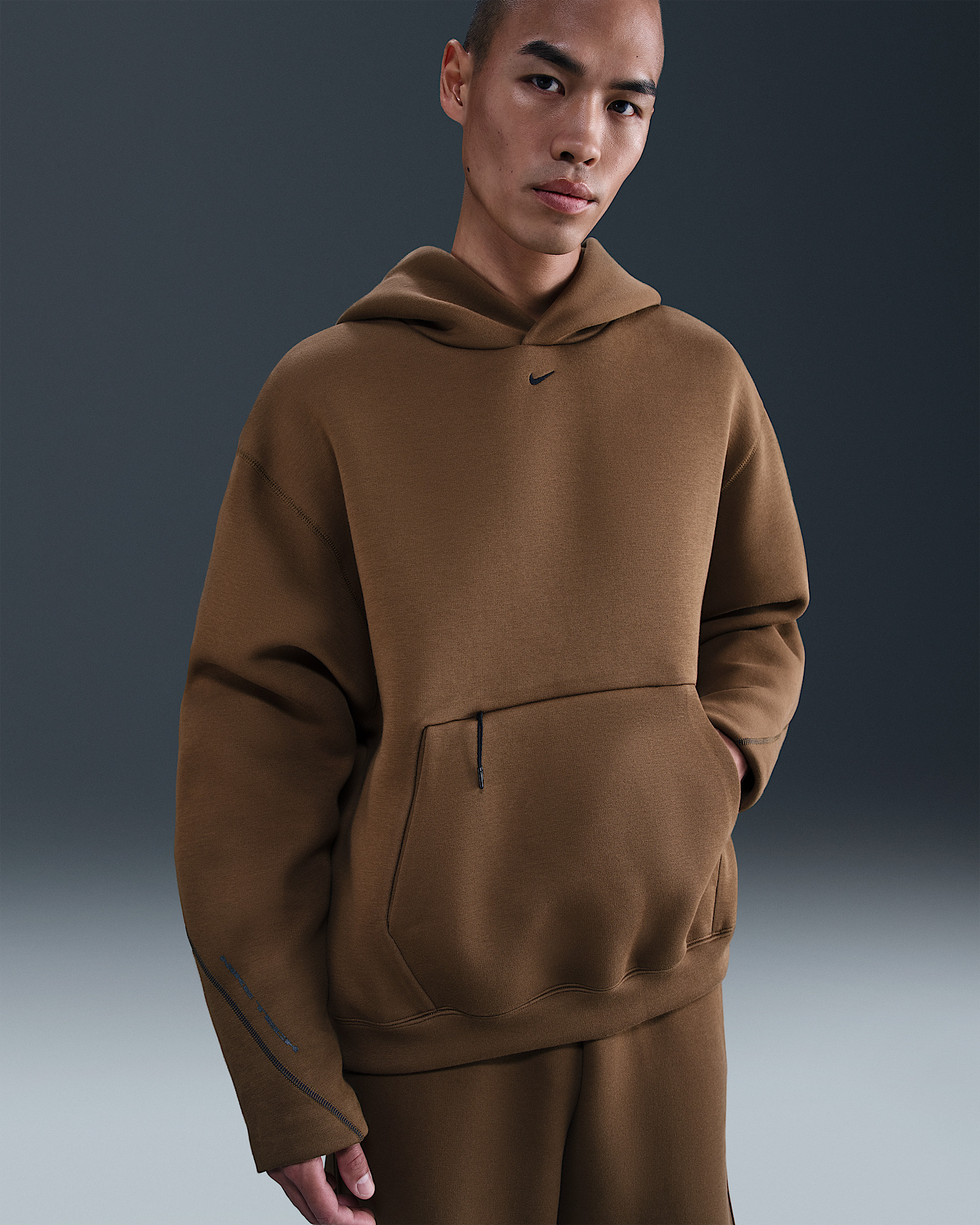 We took our iconic smooth-on-both-sides fleece and delivered a heavyweight version that's our thickest and warmest yet. It's paired with an oversized fit and technical details, like vent grommets at the sides. Benefits - This hoodie is made with the thickest and warmest version yet of our premium, smooth-on-both-sides fleece. - Oversized fit is slightly longer and extra roomy through the body and sleeves. - Vent grommets help keep heat and humidity from getting out of control. - Pouch pocket has side entry and separate zipper compartment at top. Product Details - Embroidered Nike Swoosh logo - Reflective stitches at sleeves - Not intended for use as Personal Protective Equipment (PPE) - 62% polyester/38% cotton - Machine wash - Imported - Shown: Mosswood Brown/Black - Style: HV6535-235 SIZE & FIT Model is wearing size M and is 5′11″180cm Oversized fit: exaggerated and spacious