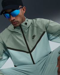Crafted with stretchy, breathable material, the Nike Tech Woven Jacket offers you ease of movement and adjustable details. Bungee cords with cord locks create a custom fit at the hem and hood. Benefits - Lightweight fabric moves sweat away from your skin for quick evaporation, helping you stay dry and comfortable. - Loose fit through the body allows a full range of movement. - Articulated elbows are made with movement in mind, and add a distinct Nike Tech aesthetic. - Hood and stand collar offer coverage from the elements. - Two-way zipper lets you adjust your fit. - Bungee cords with cord locks create a custom fit at the hem and hood. Product Details - Nike Futura logo - Body: 94% nylon/6% spandex. Pockets: 100% polyester. - Machine wash - Imported - Shown: Cannon/Clay Green/Black - Style: HM7151-018 SIZE & FIT Loose fit: roomy and relaxed Fits large; we recommend ordering a size down