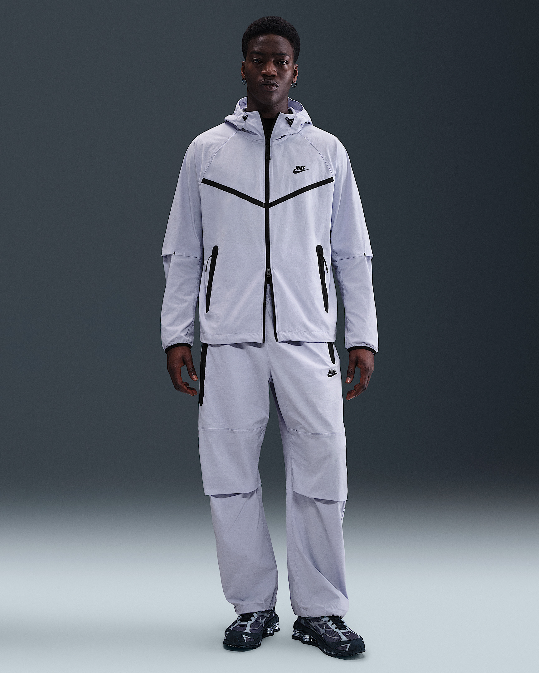 Crafted with stretchy woven material, these Nike Tech pants offer you ease of movement and adjustability. The wide-leg cut is paired with bungee locks at the ankles that let you switch up the fit. Benefits - Lightweight fabric moves sweat away from your skin for quick evaporation, helping you stay dry and comfortable. - Oversized fit offers plenty of space through the thighs and legs. - Articulated knees are made with movement in mind, and add a distinct Nike Tech aesthetic. - Stretchy elastic waistband with bungee drawcord provides a custom fit. Product Details - Nike Futura logo - Extralong taped Tech pocket - Hand pocket on the left - Body: 94% nylon/6% spandex. Pocket Bags: 100% polyester. - Machine wash - Imported - Shown: Ghost/Ghost/Black - Style: HM7158-057 SIZE & FIT Model is wearing size M and is 6′3″189cm Oversized fit: exaggerated and spacious 78 length: hits at ankle Fits large; we recommend ordering a size down