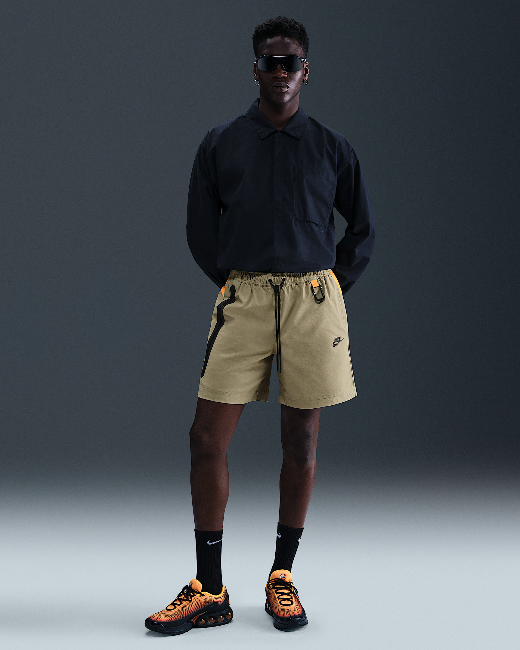 Bringing the fresh Tech aesthetic, these shorts have polished details like an extra-long Tech pocket and a bolo-inspired drawcord. They're crafted with smooth, stretchy material that hits just above the knee. Benefits - Loose fit feels roomy through the seat and thighs for easy movement and casual styling. - Carabiner adds a functional attachment for keys. Product Details - Elastic waistband with adjustable waist toggle - Zippered side pocket - Back snap pocket - Body: 94% nylon/6% spandex. Pocket bags: 100% polyester. - Machine wash - Imported - Shown: Neutral Olive/Sundial - Style: IB8957-276 SIZE & FIT Model is wearing size M and is 6′3″189cm Big & Tall model is wearing size 3XL and is 6'5"196cm Loose fit: roomy and relaxed