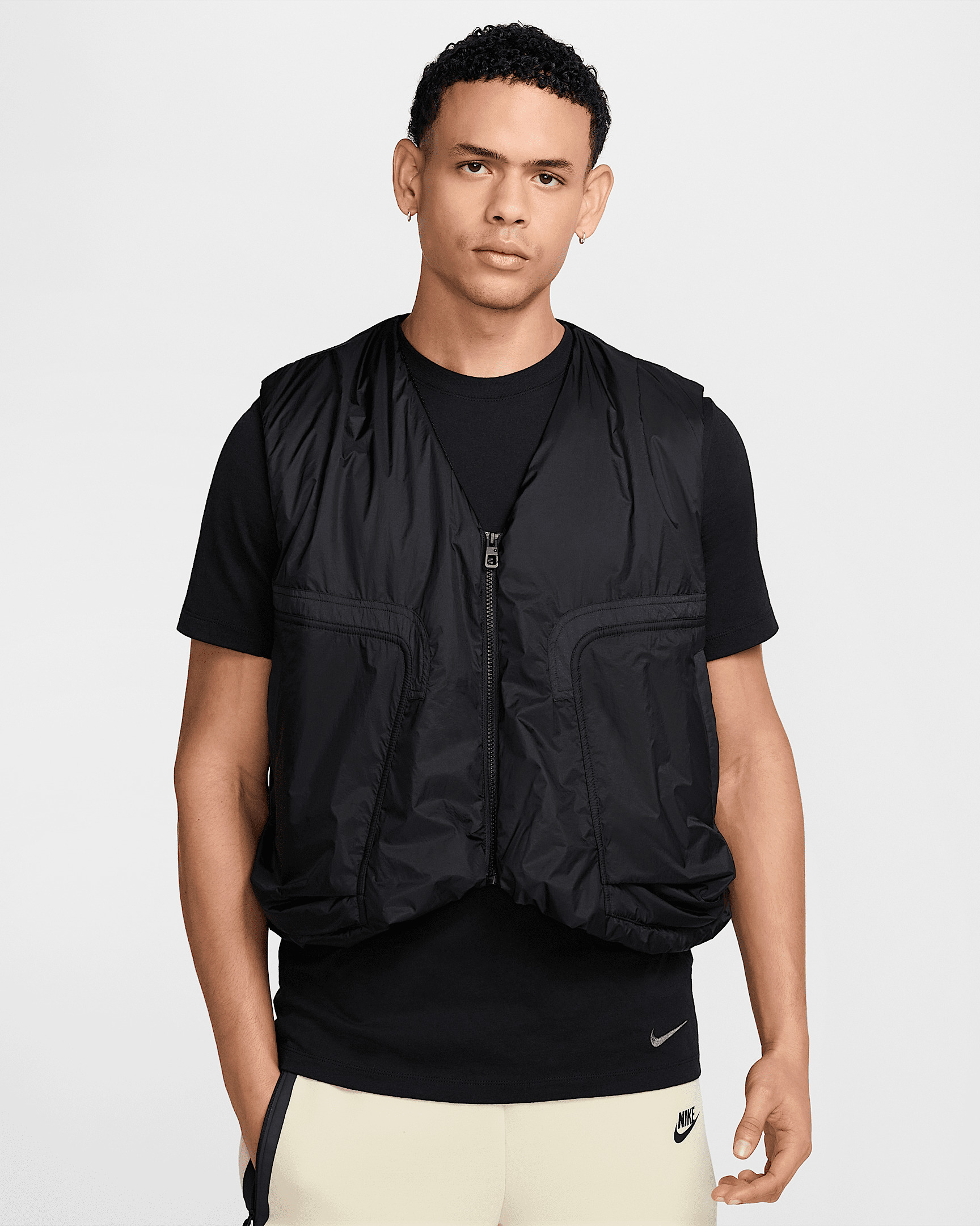 Add lightweight warmth and deep pockets to your 'fit with this roomy vest. Built like a vintage fishing vest, it's made with smooth and satiny nylon ripstop and a touch of insulation. Benefits - Zipper closure at the front pairs with a hidden snap button at the top. - Storage includes hand pockets and a mesh drop-in pocket on the inside. Product Details - Embroidered Swoosh logo - Body: 100% nylon. Lining: 100% nylon. Fill: 100% polyester. - Machine wash - Imported - Shown: Black/Black - Style: HM4262-010 SIZE & FIT Model is wearing size M and is 6′1″185cm Loose fit: roomy and relaxed