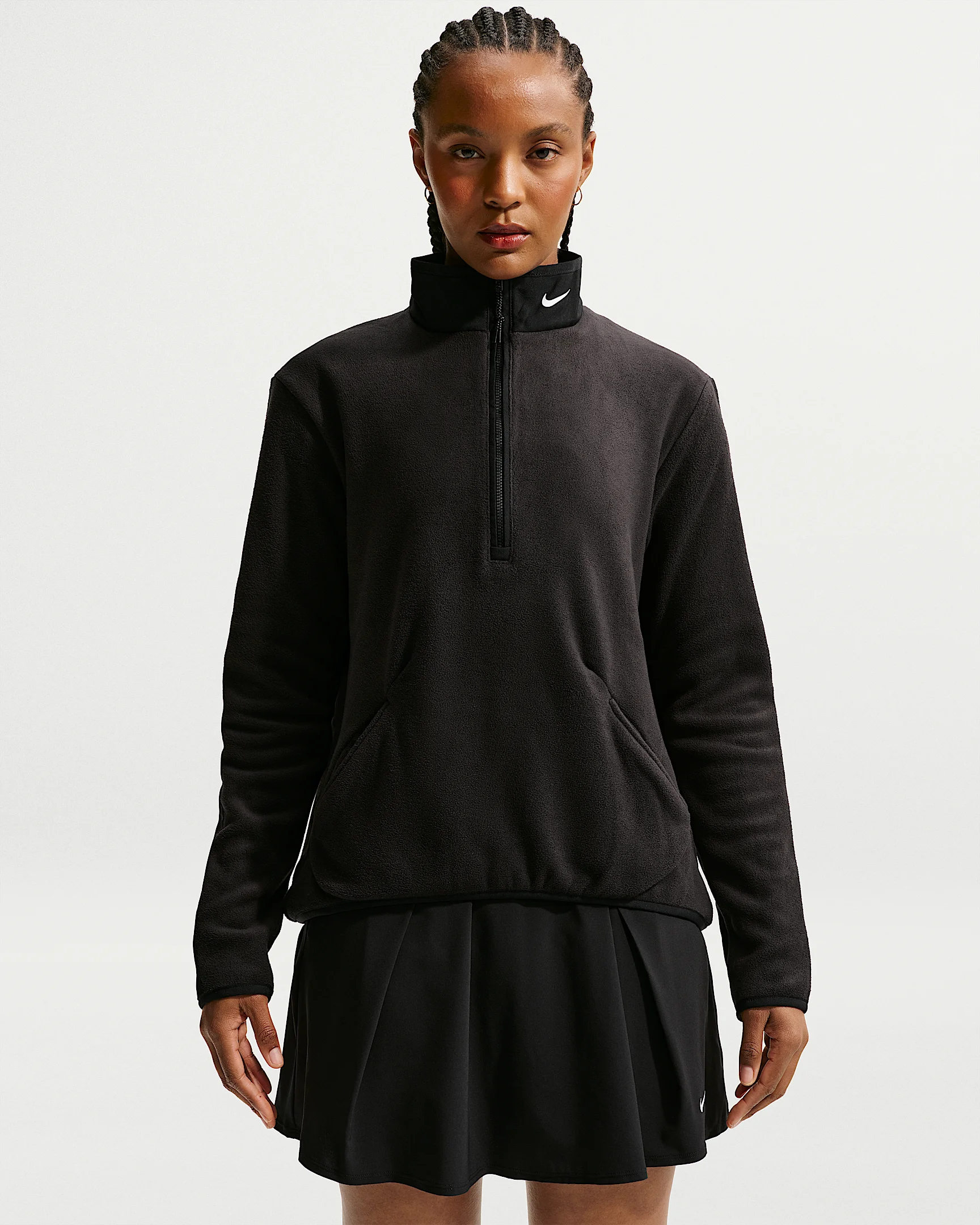 The Nike Therma-FIT Victory Top is the perfect piece for the course, the concrete and everywhere in between. It keeps you comfortable thanks to super soft, cozy fabric and a 1/2-length zipper for easy layering on the go. Benefits - Nike Therma-FIT technology helps manage your body’s natural heat to help keep you warm in cold-weather conditions. - French terry fabric is incredibly soft and cozy. - Elongated 1/2-length zipper makes layering quick and easy. - Zipper guard at the top of the collar feels soft against your chin. - Woven overlay on the collar and back sleeves adds contrast. Product Details - Standard fit for a relaxed, easy feel - 2 side pockets - 100% polyester - Machine wash - Imported - Shown: Black/Black/White - Style: DA3236-010 SIZE & FIT Standard fit: easy and traditional