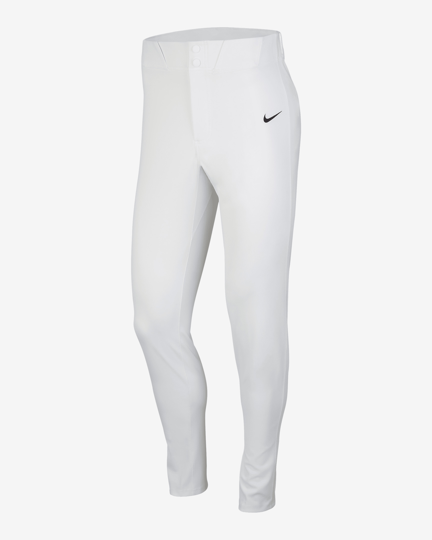 Feel pro-ready with these durable, movement-friendly baseball pants. They feature sweat-wicking Dri-FIT ADV technology and are lined with grip material around the waistband and cuffs to help keep your uniform in place. Benefits - Nike Dri-FIT ADV levels up our sweat-wicking technology with advanced cooling and zones of breathability to help you stay dry and comfortable. - Lightweight, stretchy fabric lets you move naturally as you sprint, steal and slide. Durable construction stands up to all-out play. - Elastic waistband is lined with gripping material that helps keep the pants in place. - Offset snaps reduce bulk under your belt buckle. Product Details - Back pockets - Belt loops - Front zipper - Body: 95% polyester/5% spandex. Panel/Pocket bags: 100% polyester. - Machine wash - Imported - Shown: White/Black - Style: FZ1377-100 SIZE & FIT Sm fit: sleek and tailored