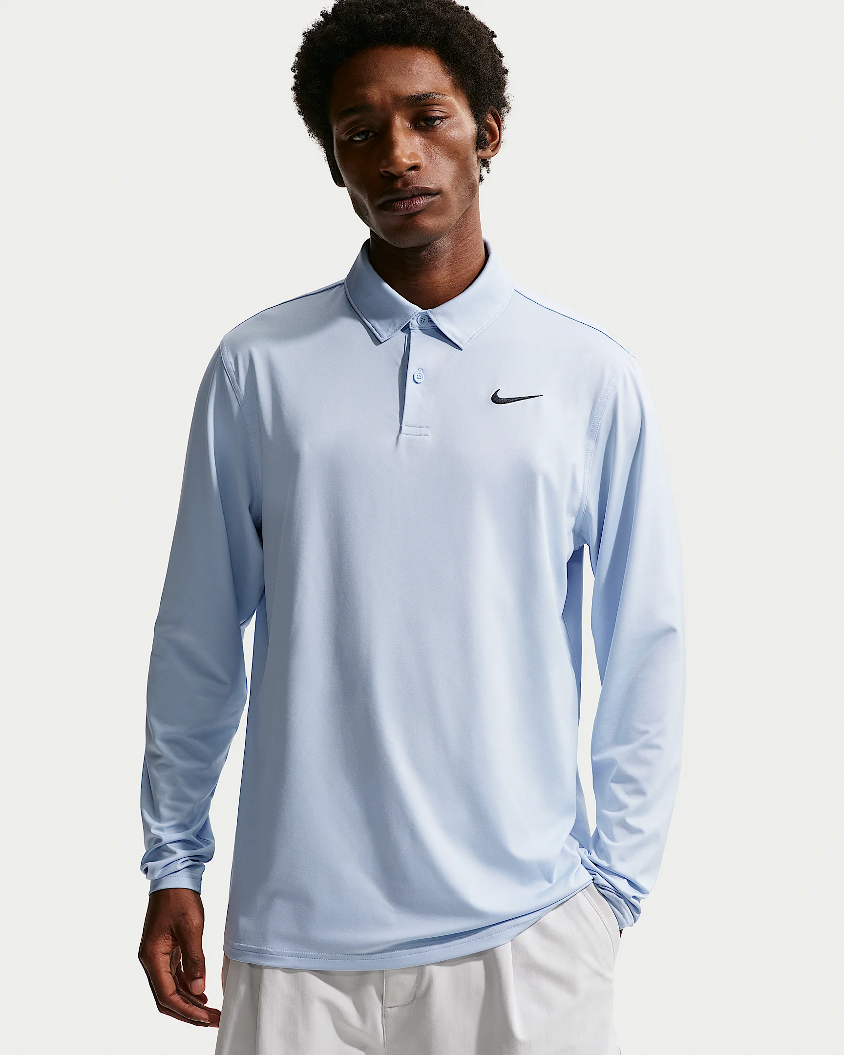Add warmth to your bag without sacrificing mobility. This long-sleeve uses a stretchy, sweat-wicking fabric that helps keep you warm without overheating while you play in cooler conditions. Benefits - Smooth four-way stretch, performance fabric allows you to move through your swing without restriction. - Fabric has a subtle sheen and drape for a polished look on and off the course. - Nike Dri-FIT technology moves sweat away from your skin for quicker evaporation, helping you stay dry and comfortable. Product Details - 90% polyester/10% spandex - Stretchy knit fabric - Embroidered Swoosh logo - 2-button placket - Machine wash - Imported - Shown: Hydrogen Blue/Black - Style: IB0239-407 SIZE & FIT Model is wearing size M and is 6′1″185cm Standard fit: easy and traditional