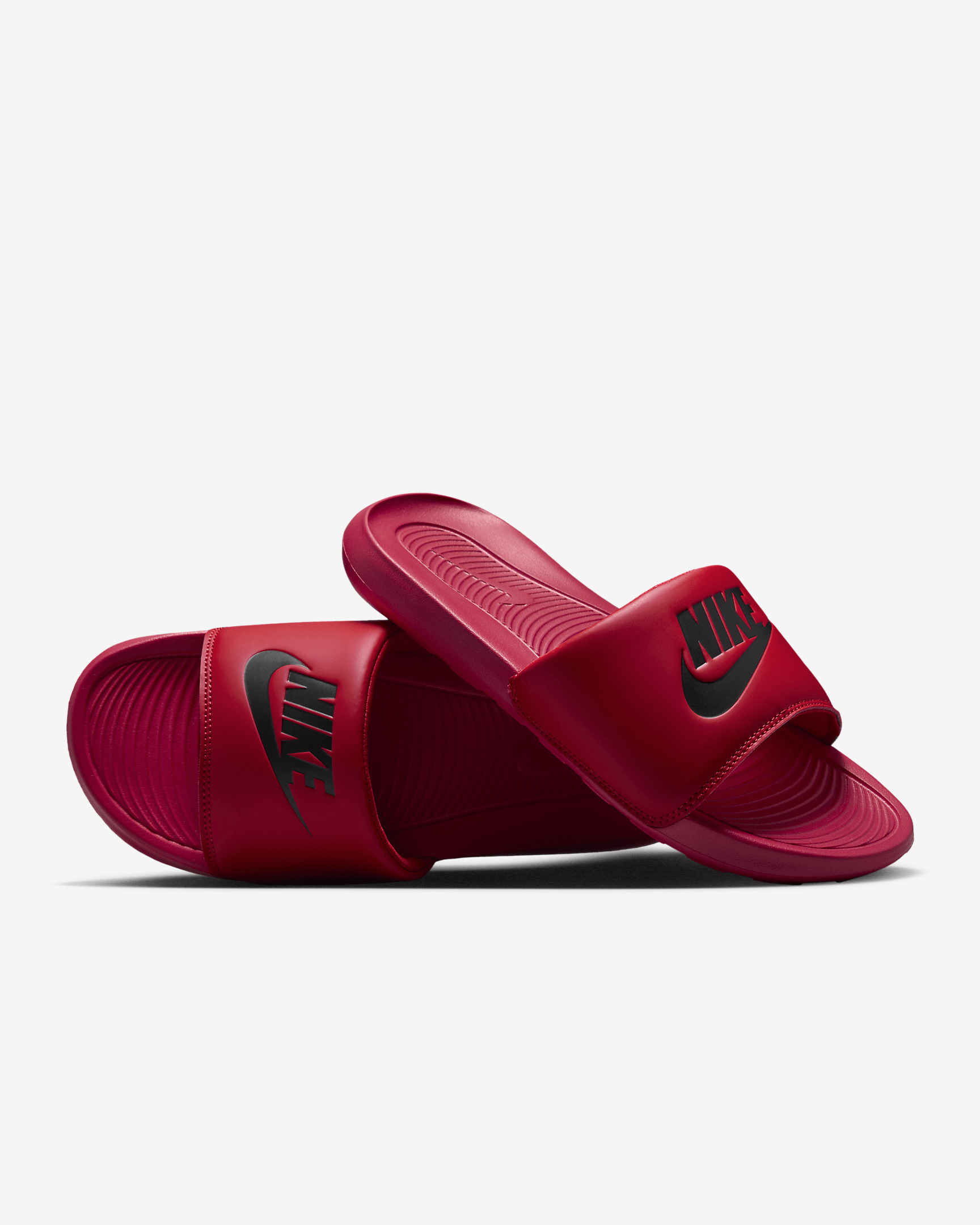 From the beach to the bleachers, the Victori One is a must-have slide for everyday activities. Subtle yet substantial updates like a wider strap and softer foam make lounging easy. Go ahead—enjoy endless comfort for your feet. Benefits - Soft foam adds responsiveness and cushioning. - Textured pattern on the contoured footbed adds grip to help your feet stay in place. - Rolled edges on the padded strap creates a smooth, comfortable feel. - Wider strap provides additional space to help accommodate more sizes. - Outsole pattern is designed for multi-surface traction. Product Details - Shown: University Red/University Red/Black - Style: CN9675-600