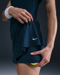 Made with super-smooth, ultra-stretchy fabric that dries quickly, this flouncy skirt makes it easy to focus on your swing. Built-in shorts with pockets offer storage for your essentials and coverage in all your stances. Benefits - Nike Dri-FIT technology moves sweat away from your skin for quicker evaporation, helping you stay dry and comfortable. - Drop-in pockets on both legs of inner shorts fit most phones. - Inner shorts let you tuck spare balls under the hem for convenient storage. Product Details - Body: 79% polyester/21% spandex. Rib: 88% polyester/12% spandex. Tight/Waist lining: 82% polyester/18% spandex.Gusset lining: 100% polyester. - Machine wash - Imported - Shown: Armory Navy/White - Style: FD5577-478 SIZE & FIT Model is wearing size S and is 5′10″178cm Standard fit: easy and traditional