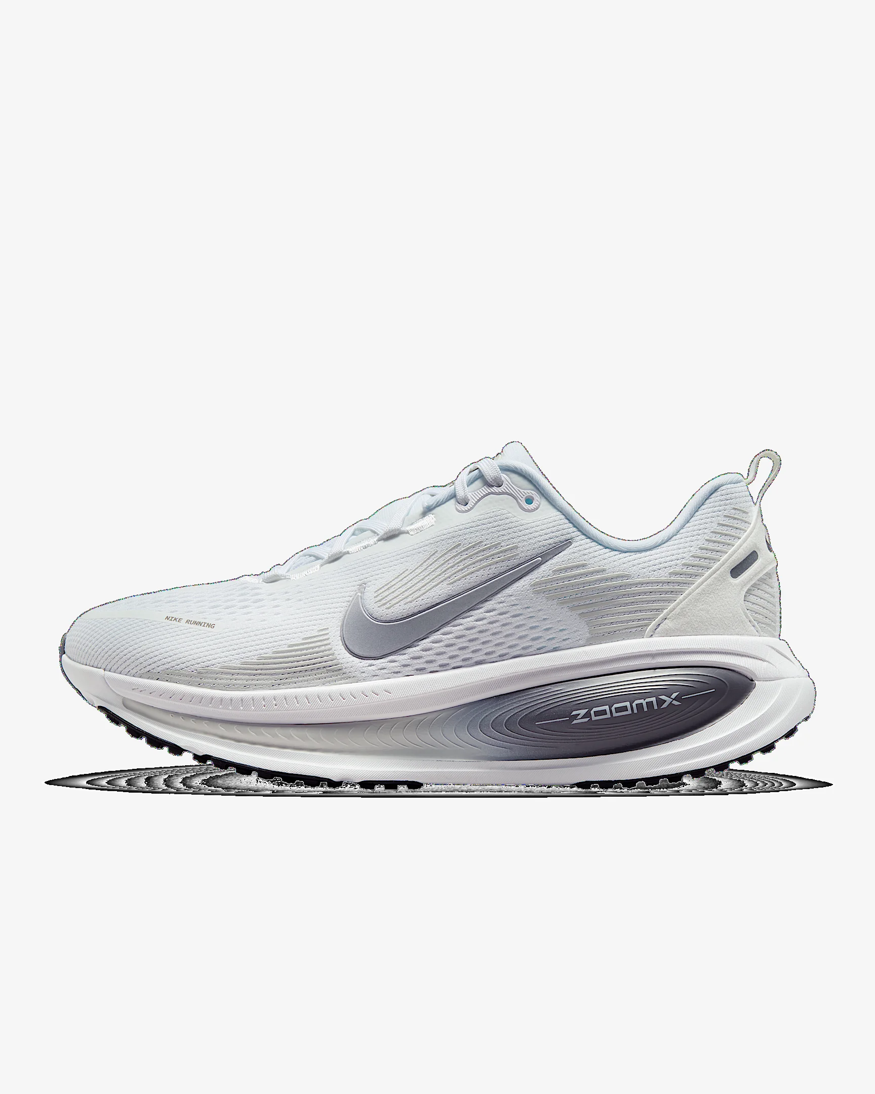 Maximum cushioning in the Vomero provides a comfortable ride for everyday runs. Our softest, most cushioned ride has lightweight ZoomX foam stacked on top of responsive ReactX foam in the midsole. Plus, a redesigned traction pattern offers a smooth heel-to-toe transition. Product Details - Weight: Approx. 263g/9.3oz (Women’s US 8) - Heel-to-toe drop: 10mm - MR-10 Last - Our best, most consistent fit - Not intended for use as Personal Protective Equipment (PPE) - Shown: White/Photon Dust/Metallic Silver/Gunsmoke - Style: IB4032-107