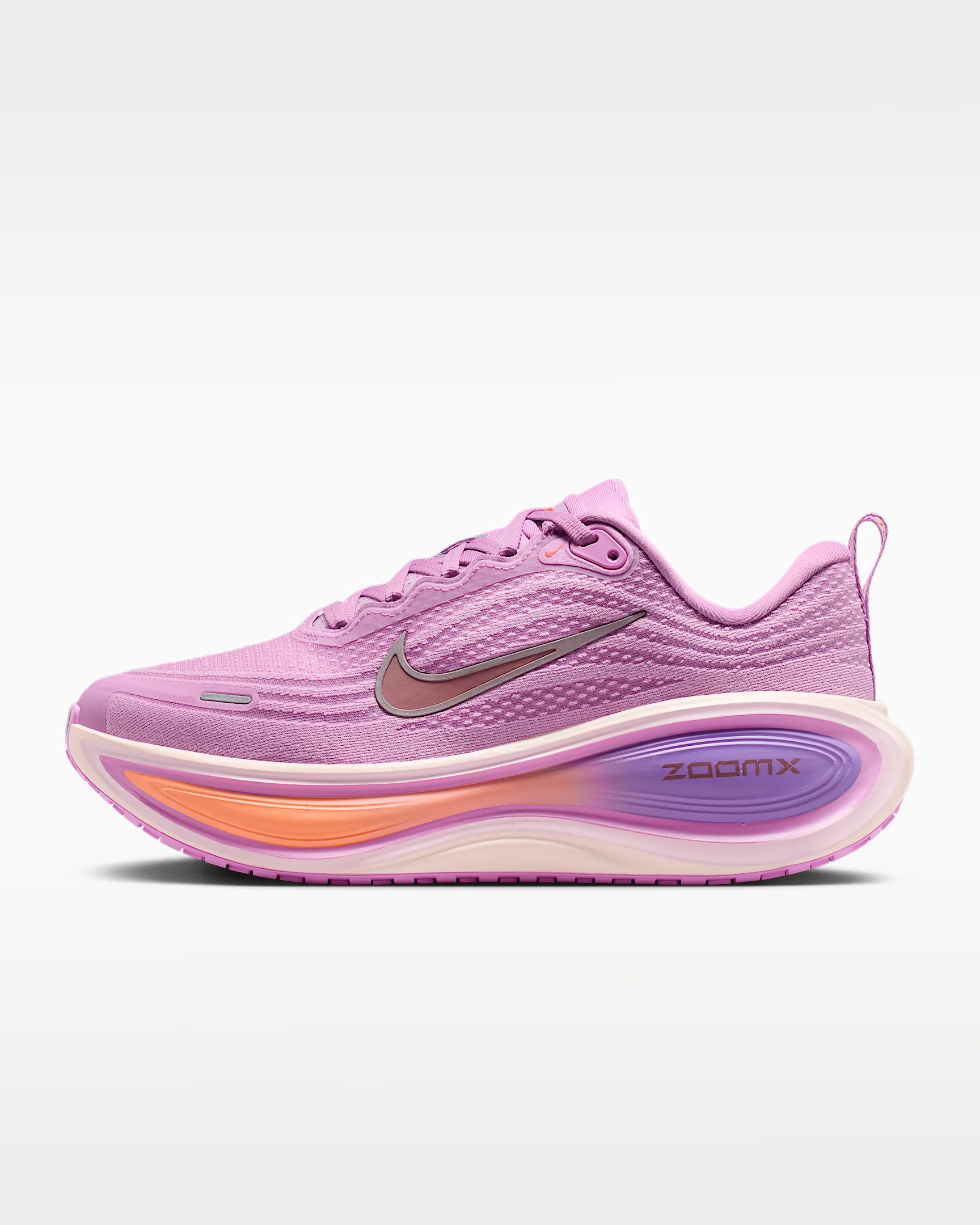 Take maximum cushioning to the next level with the Vomero Plus. It provides an ultra-comfortable ride for every day runs thanks to a mountainous stack of full-length ZoomX foam, the most responsive foam in the industry. Plus, the engineered mesh upper is made of soft, breathable yarn for a comfortable fit. Product Details - Weight: Approx. 230g/8.1oz (Women's US 8) - Heel-to-toe drop: 10mm - Webbed lace loops for an adjustable fit - Reflective details - Not intended for use as Personal Protective Equipment (PPE) - Shown: Light Magenta/Pink Foam/Bright Violet/Black - Style: IH3252-503