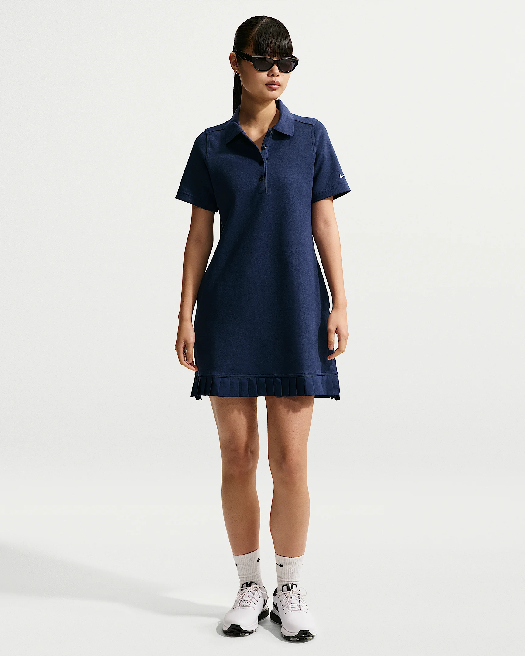 Level up your course outfit. This polo dress is crafted in midweight, breathable pique fabric and finished with a pleated hem so you can move with comfort and flair. Product Details - 4-button placket - Printed Nike Golf logo on back - Printed Swoosh logo on left arm - Body: 70% cotton/30% polyester. Bottom hem: 100% polyester. - Machine wash - Imported - Shown: Midnight Navy/Sail - Style: IF8522-410 SIZE & FIT Model is wearing size S and is 5′9″175cm Standard fit: easy and traditional