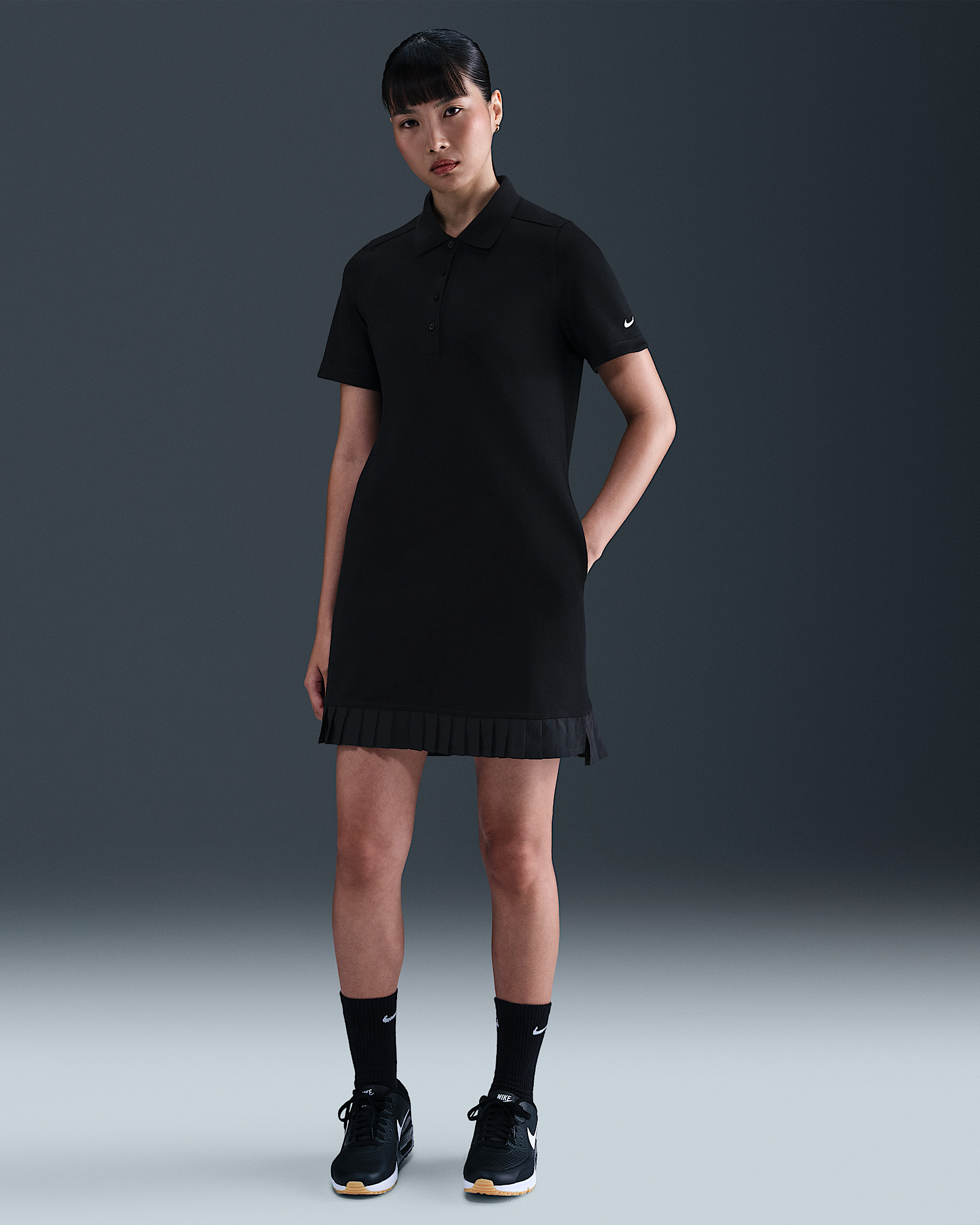 Level up your course outfit. This polo dress is crafted in midweight, breathable pique fabric and finished with a pleated hem so you can move with comfort and flair. Product Details - 4-button placket - Printed Nike Golf logo on back - Printed Swoosh logo on left arm - Body: 70% cotton/30% polyester. Bottom hem: 100% polyester. - Machine wash - Imported - Shown: Black/Sail - Style: IF8522-010 SIZE & FIT Model is wearing size S and is 5′9″175cm Standard fit: easy and traditional