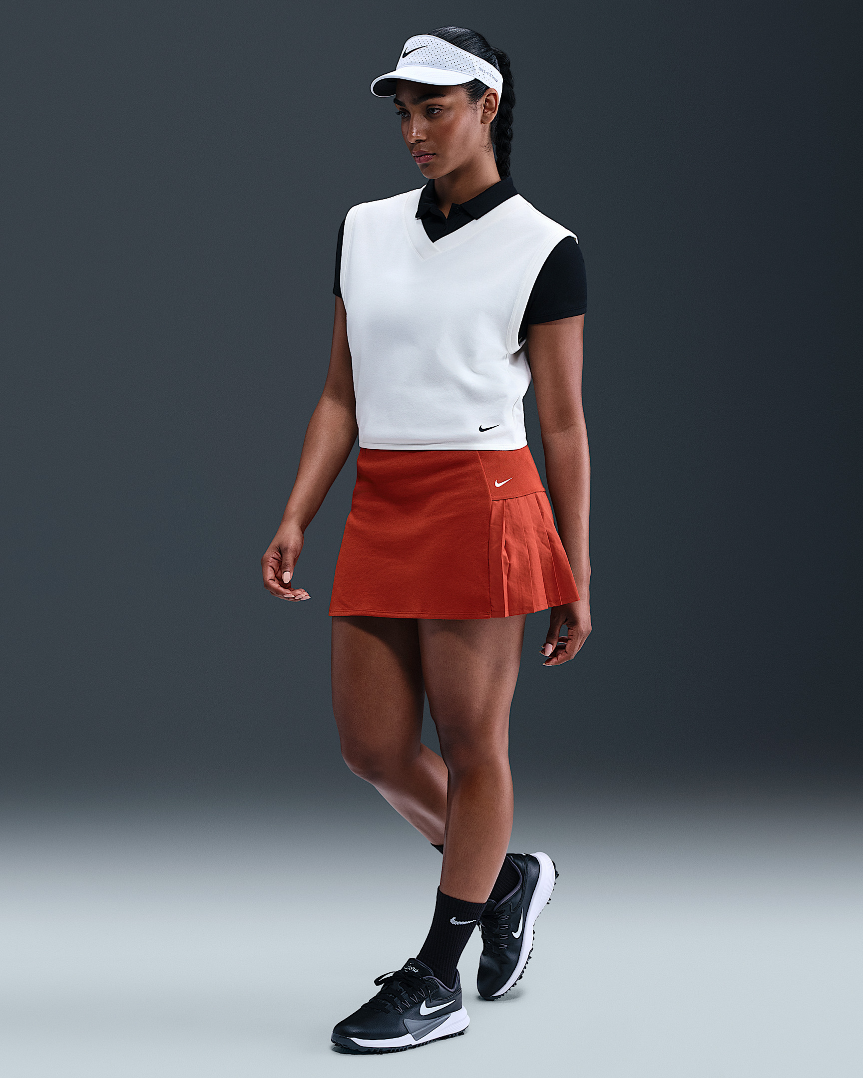Level up your course outfit. This skirt combines breathable pique fabric with a woven pleated panel for elevated comfort and movement. Benefits - Internal drawcord helps you dial in your perfect fit. - Pocket on back stores your golf essentials. Product Details - Printed Nike Golf logo on back right - Printed Swoosh logo on left hip - Body: 70% cotton/30% polyester. Panels/Back pocket: 100% polyester. - Machine wash - Imported - Shown: Dragon Red/Sail - Style: IF8531-626 SIZE & FIT Model is wearing size S and is 5′9″175cm Standard fit: easy and traditional