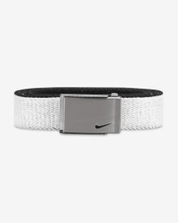 Made with stretch fabric, the Nike Reversible Golf Belt lets you move smoothly through every swing. Playing again tomorrow? It's reversible, so you can switch up your look from one day to the next. It even has a bottle opener on the buckle so you can celebrate with a refreshment after a successful round. Benefits - Stretchy web construction helps you move freely while you play. - Reversible design lets you change up your look from one round to the next. - Easy-to-adjust clamp buckle helps keep the belt in place while you move. - Bottle opener on the back of the buckle means you're always ready for your next cold beverage. Product Details - Width: 32 mm - Fits up to size 42 - Swoosh logo cutout on buckle - 80% polypropylene/20% rubber - Made in the USA - Shown: Black - Style: 131250-004