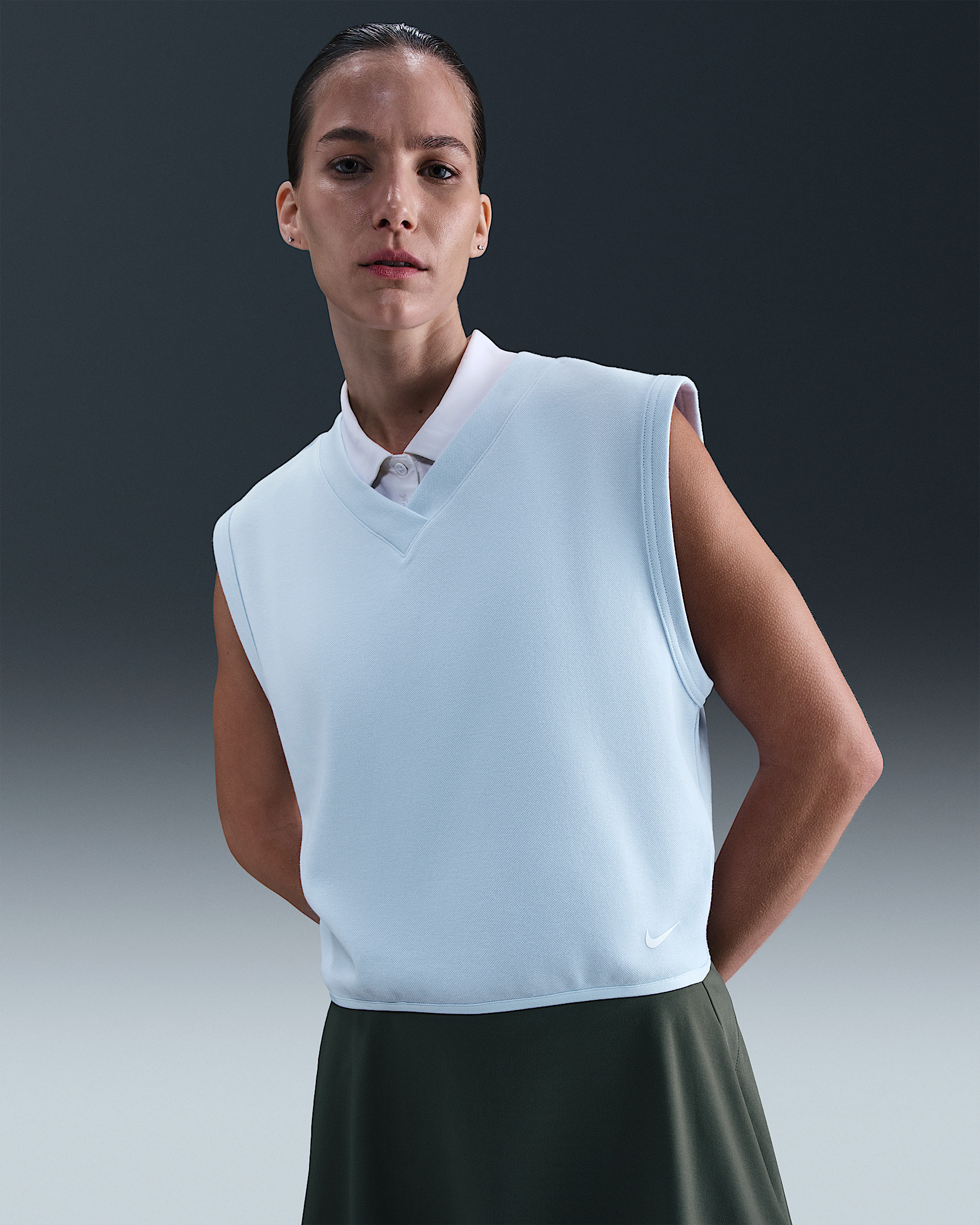 This timeless vest gets a modern update with elastic at the hem and a slightly cropped length. It's crafted with midweight pique fabric for breathable comfort across the course. Benefits - Large armholes give you freedom to power through your swing. - Elastic at hem cinches in the fit. Product Details - Printed Nike Golf logo at back - Printed Swoosh logo at bottom hem - 70% cotton/30% polyester - Machine wash - Imported - Shown: Celestine Blue/Sail/Sail - Style: IH0939-441 SIZE & FIT Model is wearing size S and is 5′10″178cm Standard fit: easy and traditional