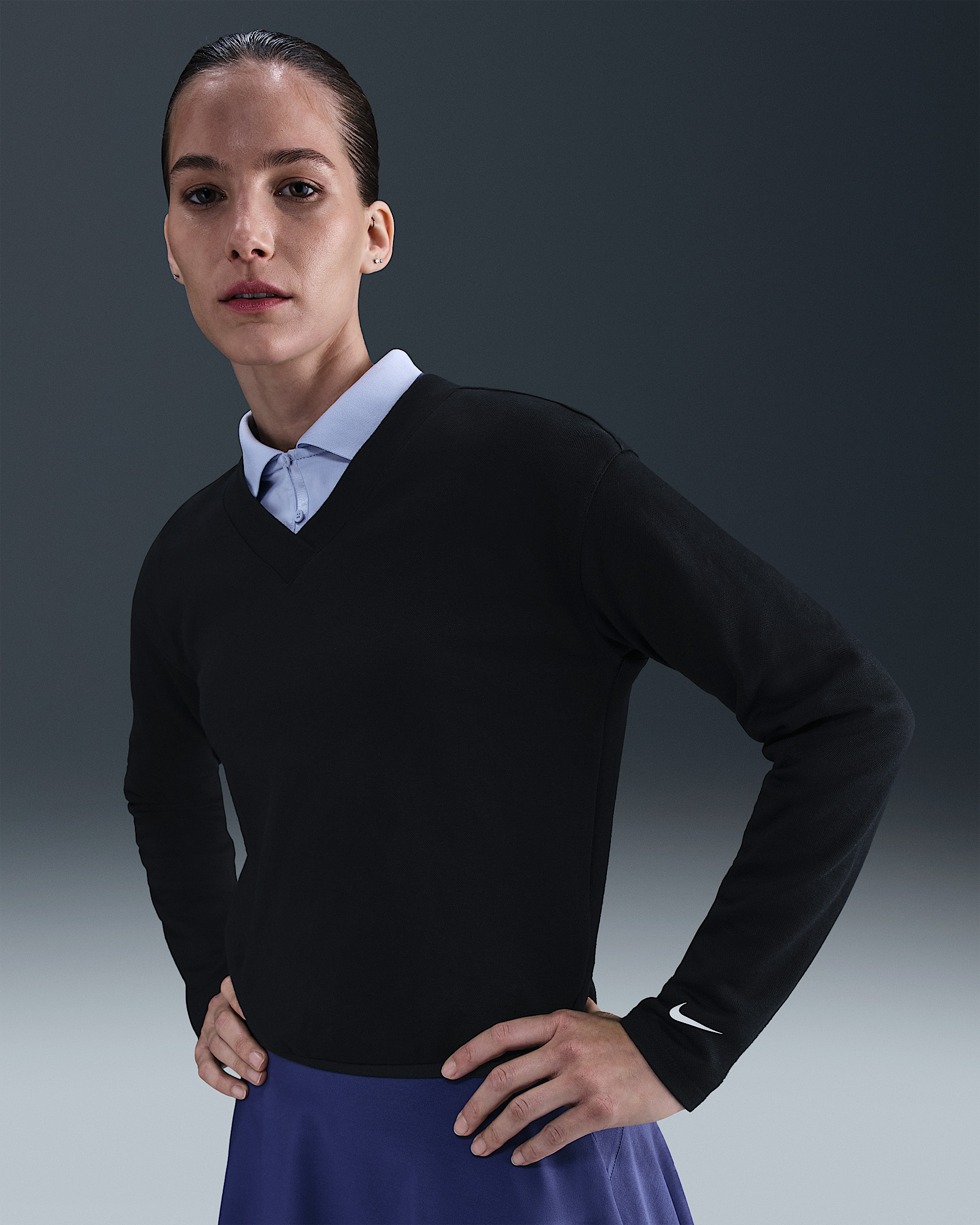 The timeless design of a V-neck golf sweater gets a modern update with taping at the hem for a slightly cropped feel and a fresh golf look. Its soft pique fabric is lightweight and easy to layer. Some stretch means it'll never slow down your swing. Product Details - Body: 80% cotton/20% polyester. Rib: 97% cotton/3% spandex. - Nike Golf logo - Swoosh logo - Machine wash - Imported - Shown: Black/Black/Sail - Style: IH1945-010 SIZE & FIT Model is wearing size S and is 5′10″178cm Standard fit: easy and traditional