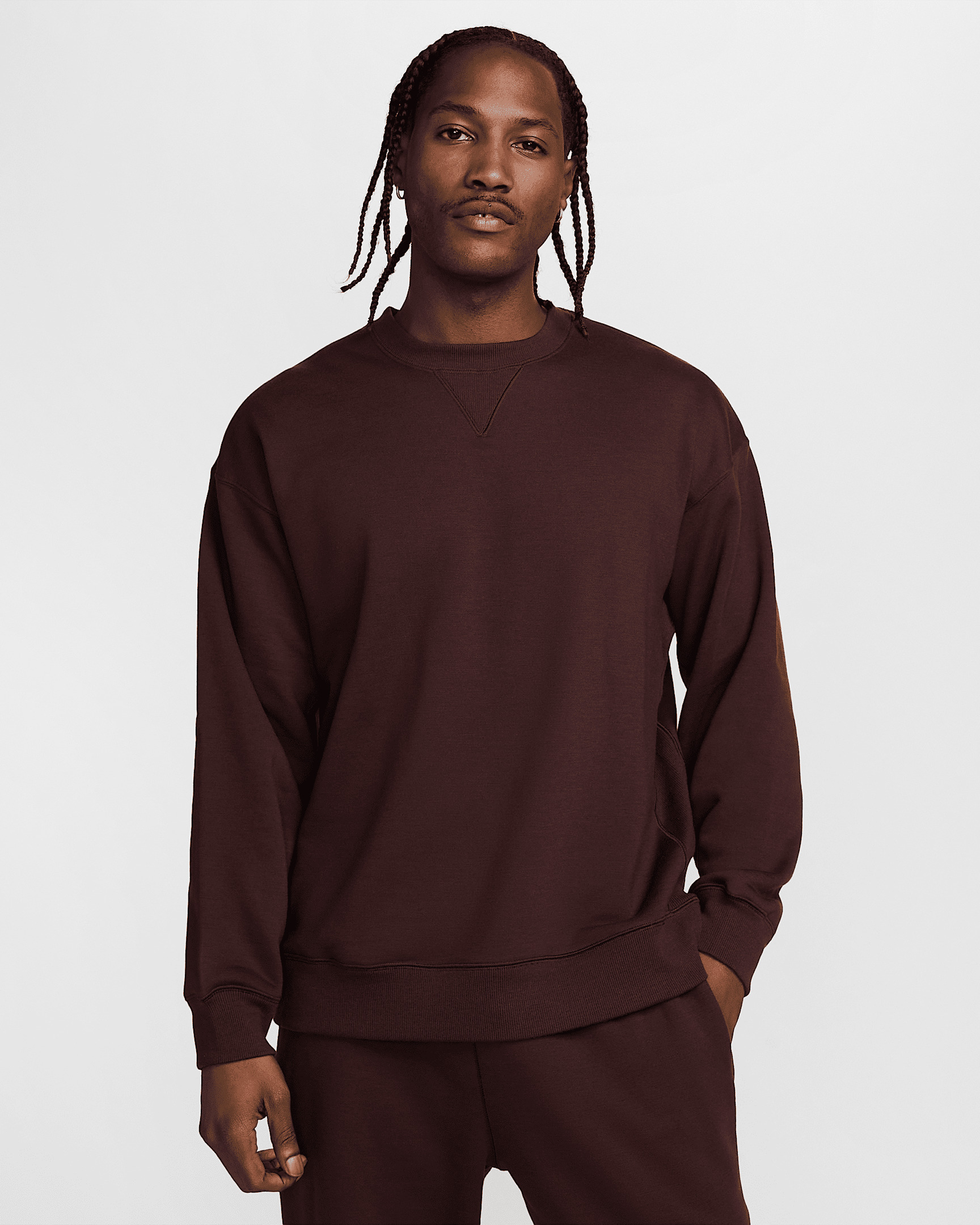 Your classic crew, elevated. It blends high-quality, heavyweight fabrics like wool and cotton for breathable warmth with an ultra-plush feel. A roomy fit keeps your look casual while tonal branding means easy styling. Product Details - 51% cotton/44% wool/5% nylon - Machine wash - Imported - Shown: Brown Basalt - Style: FV4883-203 SIZE & FIT Model is wearing size M and is 6′2″188cm Loose fit: roomy and relaxed