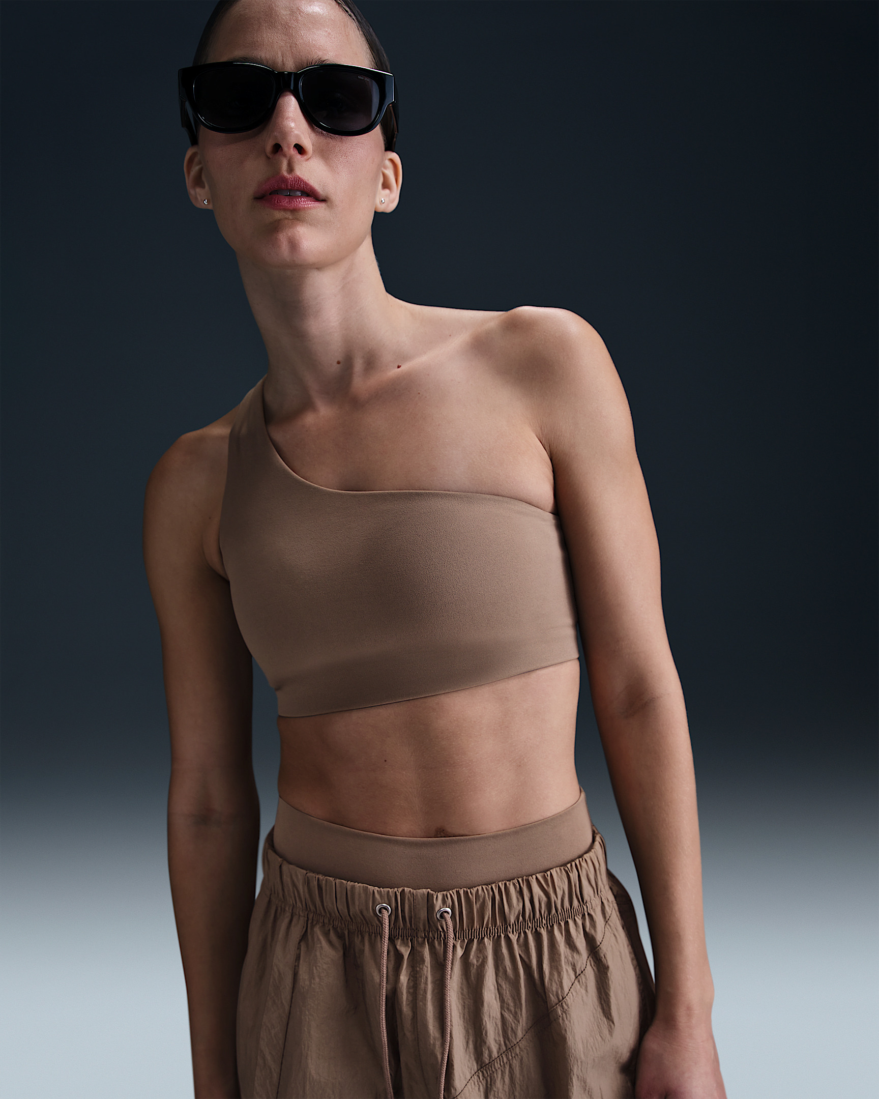 Balance your day in comfort in this asymmetrical Zenvy sports bra. Its lightweight InfinaSoft fabric gives you softness that you can feel with every bend, stretch and shift. Benefits - Nike Dri-FIT technology moves sweat away from your skin for quicker evaporation, helping you stay dry and comfortable. - Two sewn-in pads resist shifting for reliable coverage. - Light support gives you a gentle hold with plenty of freedom. Product Details - Body: 63% nylon/37% spandex. Lining: 80% polyester/20% spandex. Pad Back Fabric: 100% polyester. Pad: 100% polyurethane. - Machine wash - Imported - Shown: Mink Brown/White - Style: HQ9182-233 SIZE & FIT Model is wearing size S Model height: 5′10″178cm Model bust: 34″86cm Tight fit: snug and form-fitting Light support: feels ke a soft hug with plenty of freedom
