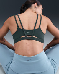 Feel calm and confident all day long in this strappy, gently supportive bra. A sewn-in 1-piece pad offers enhanced coverage and shaping while sweat-wicking technology helps keep you cool and comfortable. The fabric in the body and straps is lightweight, with softness that you can feel with every bend, stretch and shift. With a rounded V-neck to top it off, the bra has a clean finish that goes with any outfit. Benefits - Light support gives you a gentle hold with plenty of freedom that's great for low-impact workouts or all-day comfort. - Nike Dri-FIT technology moves sweat away from your skin for quicker evaporation, helping you stay dry and comfortable. Product Details - Body: 63% nylon/37% spandex. Front and back liner: 82% polyester/18% spandex. Pad: 100% polyurethane. Pad back fabric: 100% polyester. - Machine wash - Imported - Shown: Seaweed/White - Style: DO6608-391 SIZE & FIT Model is wearing size S Model height: 5′6″168cm Model bust: 32″81cm Tight fit: snug and form-fitting Light support: feels ke a soft hug with plenty of freedom