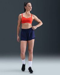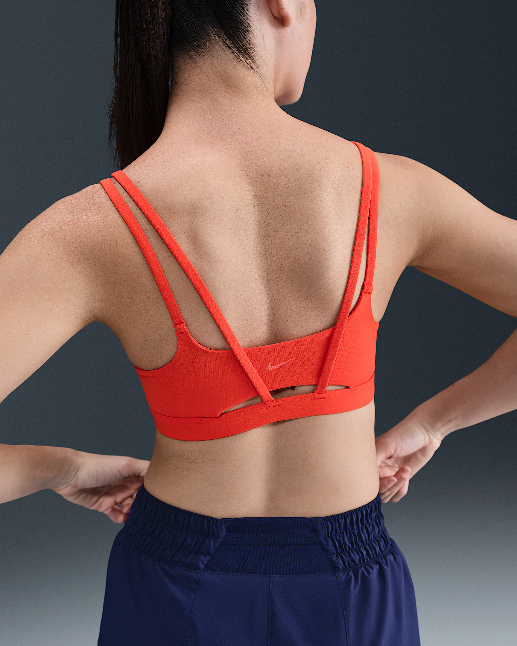 Feel calm and confident all day long in this strappy, gently supportive bra. A sewn-in 1-piece pad offers enhanced coverage and shaping while sweat-wicking technology helps keep you cool and comfortable. The fabric in the body and straps is lightweight, with softness that you can feel with every bend, stretch and shift. With a rounded V-neck to top it off, the bra has a clean finish that goes with any outfit. Benefits - Light support gives you a gentle hold with plenty of freedom that's great for low-impact workouts or all-day comfort. - Nike Dri-FIT technology moves sweat away from your skin for quicker evaporation, helping you stay dry and comfortable. Product Details - Body: 63% nylon/37% spandex. Front and back liner: 82% polyester/18% spandex. Pad: 100% polyurethane. Pad back fabric: 100% polyester. - Machine wash - Imported - Shown: Picante Red/White - Style: DO6608-633 SIZE & FIT Model is wearing size S Model height: 5′9″175cm Model bust: 32″81cm Tight fit: snug and form-fitting Light support: feels ke a soft hug with plenty of freedom