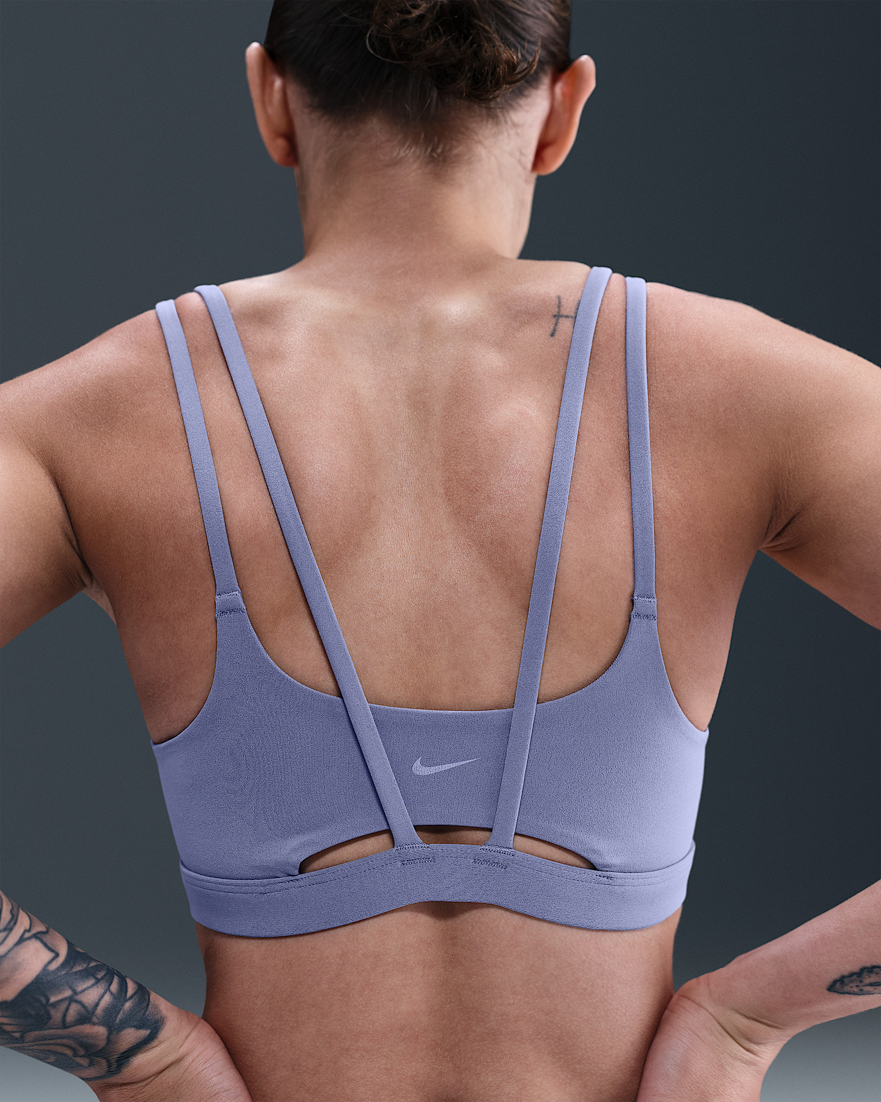 Feel calm and confident all day long in this strappy, gently supportive bra. A sewn-in 1-piece pad offers enhanced coverage and shaping while sweat-wicking technology helps keep you cool and comfortable. The fabric in the body and straps is lightweight, with softness that you can feel with every bend, stretch and shift. With a rounded V-neck to top it off, the bra has a clean finish that goes with any outfit. Benefits - Light support gives you a gentle hold with plenty of freedom that's great for low-impact workouts or all-day comfort. - Nike Dri-FIT technology moves sweat away from your skin for quicker evaporation, helping you stay dry and comfortable. Product Details - Body: 63% nylon/37% spandex. Front and back liner: 82% polyester/18% spandex. Pad: 100% polyurethane. Pad back fabric: 100% polyester. - Machine wash - Imported - Shown: World Indigo/White - Style: DO6608-499 SIZE & FIT Model is wearing size S Model height: 5′9″175cm Model bust: 33″84cm Tight fit: snug and form-fitting Light support: feels ke a soft hug with plenty of freedom