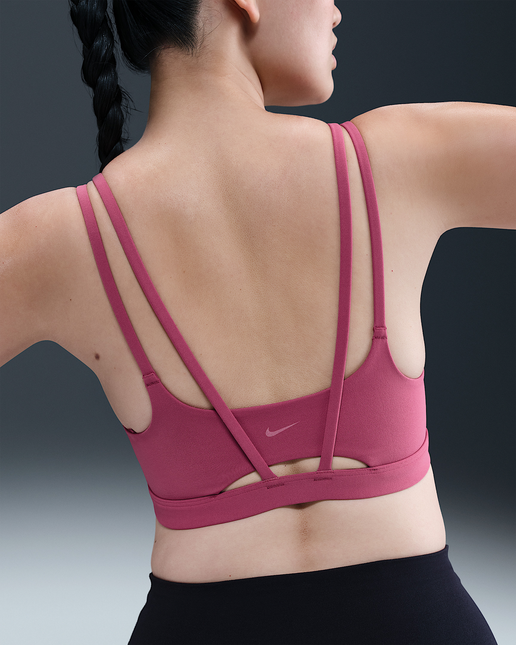 Feel calm and confident all day long in this strappy, gently supportive bra. A sewn-in 1-piece pad offers enhanced coverage and shaping while sweat-wicking technology helps keep you cool and comfortable. The fabric in the body and straps is lightweight, with softness that you can feel with every bend, stretch and shift. With a rounded V-neck to top it off, the bra has a clean finish that goes with any outfit. Benefits - Light support gives you a gentle hold with plenty of freedom that's great for low-impact workouts or all-day comfort. - Nike Dri-FIT technology moves sweat away from your skin for quicker evaporation, helping you stay dry and comfortable. Product Details - Body: 63% nylon/37% spandex. Front and back liner: 82% polyester/18% spandex. Pad: 100% polyurethane. Pad back fabric: 100% polyester. - Machine wash - Imported - Shown: Sweet Beet/White - Style: DO6608-635 SIZE & FIT Model is wearing size S Model height: 5′9″175cm Model bust: 32″81cm Tight fit: snug and form-fitting Light support: feels ke a soft hug with plenty of freedom