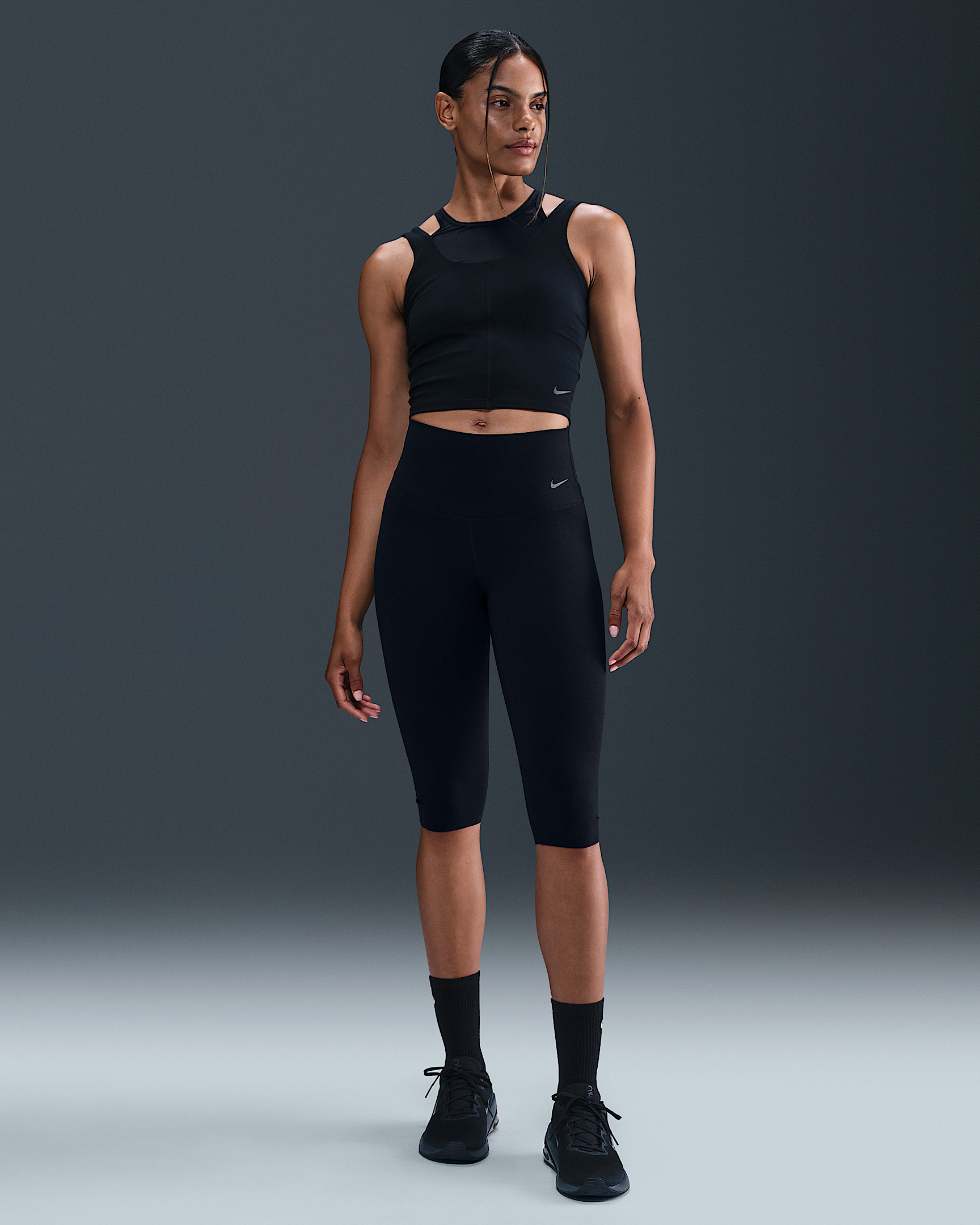 Move with total freedom in these Zenvy leggings. Their InfinaSoft fabric stretches effortlessly with you and offers lightweight softness. Benefits - Nike Dri-FIT technology moves sweat away from your skin for quicker evaporation, helping you stay dry and comfortable. - Back pocket fits most phones. Product Details - Raw-cut hem - Swoosh logo at center back - Body: 63% nylon/37% spandex. Gusset lining: 84% nylon/16% spandex. - Machine wash - Imported - Shown: Black/Black - Style: IH1932-010 SIZE & FIT Model is wearing size S and is 5′10″178cm Tight fit: snug and form-fitting Gentle support: feels ke a soft hug with plenty of freedom Capri length: hits at mid calf High-Waisted: sits at or above your natural waist for more coverage