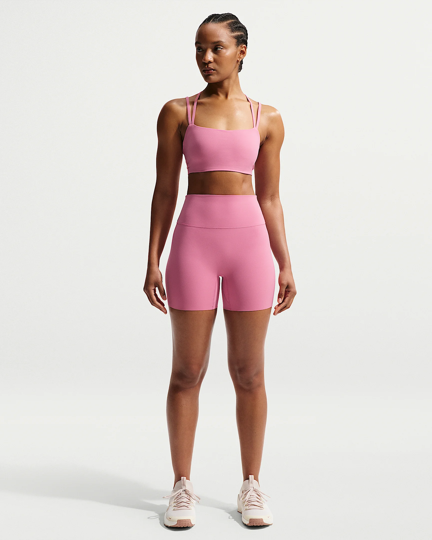 Bend and stretch in total confidence. Still lightweight, our updated InfinaSoft fabric is now ultrasoft with stretch designed to recover its shape wear after wear. Benefits - Nike Dri-FIT technology moves sweat away from your skin for quicker evaporation, helping you stay dry and comfortable. - We raised the waistband slightly for a true high-waisted fit. - No front seam helps keep the fabric from riding up, giving you a smooth fit and seamless look. - Hidden pocket at the back of the waistband fits most phones. Product Details - 5" inseam - Raw hem - No front seam - Swoosh logo on back waistband - Body: 69% nylon/31% spandex. Panels lining: 72% nylon/28% spandex. - Machine Wash - Imported - Shown: Peony/White - Style: II5209-641 SIZE & FIT Model is wearing size S and is 5′7″170cm Tight fit: snug and form-fitting Gentle support: feels ke a soft hug with plenty of freedom High-Waisted: sits at or above your natural waist for more coverage